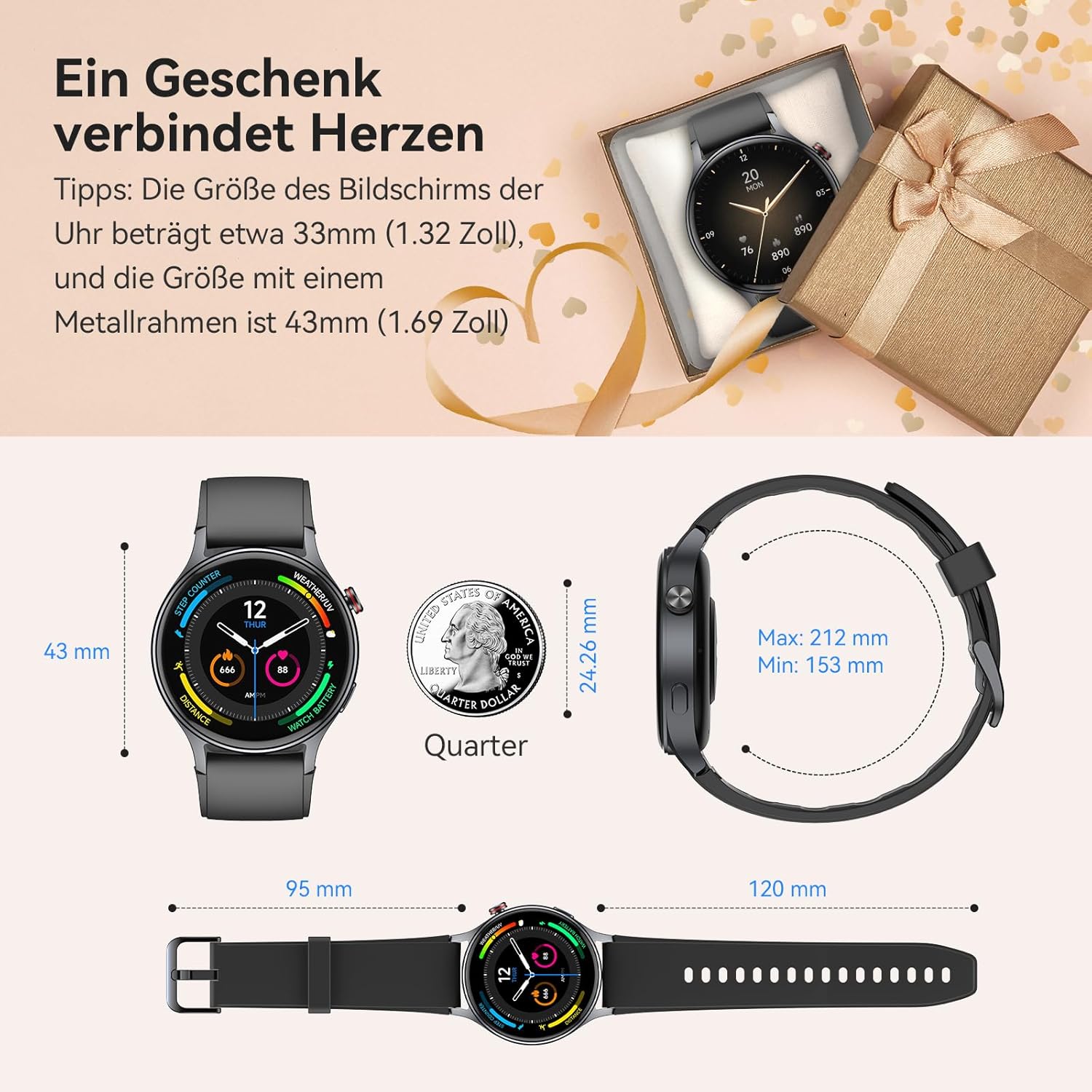 • Стилен дизайн за жени: с 1,32-инчов AOMLED екран и метални ръбове, смарт часовникът ви предлага ясно и ярко цветопредаване и отлично потребителско изживяване, особено за жени и мъже, които са приоритет за модата и фитнеса. Съвети: размерът на екрана на часовника е около 33 мм (1,32 инча), а размерът с метална рамка е 43 мм (1,69 инча). Общото тегло на часовника е приблизително 50,64 г.