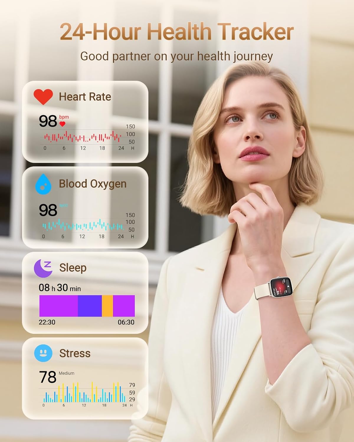 • 24/7 наблюдение на здравето: фитнес тракерът осигурява 24/7 непрекъснато измерване на вашите здравни показатели, включително сърдечна честота, стрес, SpO2, анализ на съня (дълбок сън, лек сън, събуждане). Тези данни от мониторинга могат да ви помогнат да следите здравословното си състояние, качеството на съня, както и да ви напомнят за менструалния цикъл на жените.