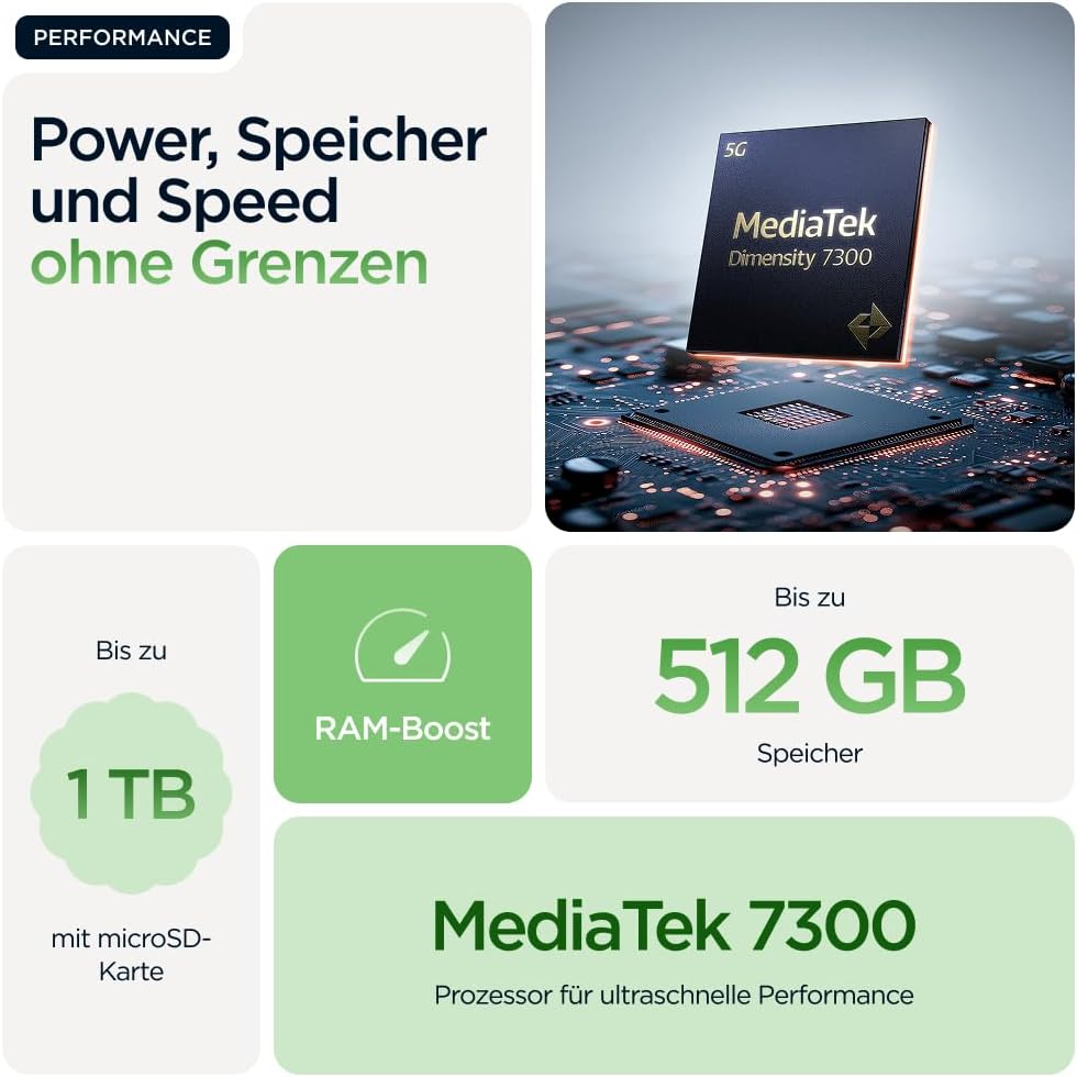 • Производителност без забавяне; Следвайте страстите си без досадни прекъсвания благодарение на ултрабързия процесор MediaTek Dimensity 7300 и до 16 GB RAM с RAM boost.