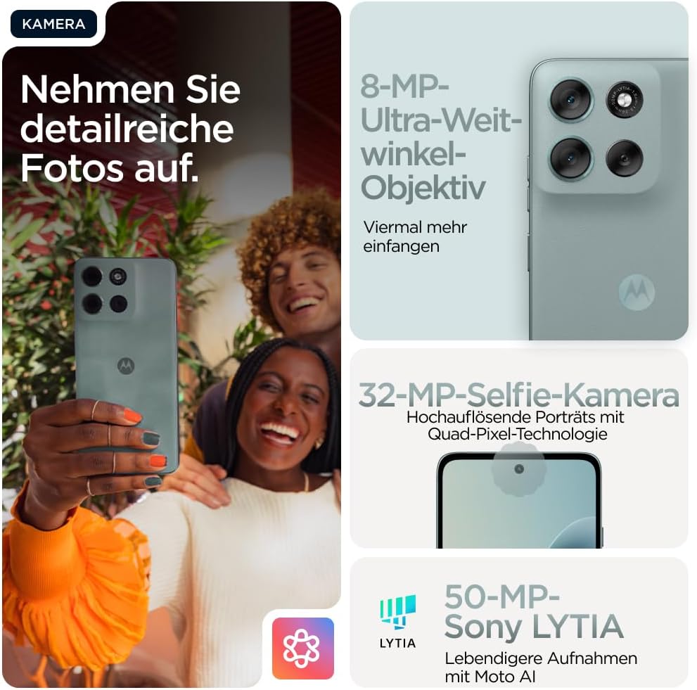 • Изключителни снимки благодарение на Sony LYTIA; правете зашеметяващи снимки с 50MP камерата Sony LYTIA 600 с поддръжка на Moto AI и снимайте без усилие като професионалист.