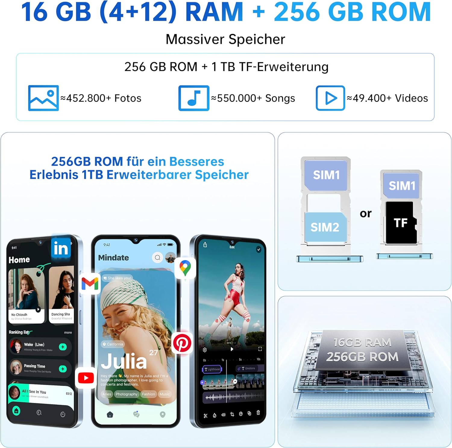 • 16GB RAM + 256GB ROM (1TB разширяема): Смартфонът OUKITEL C3 разполага с технология за разширяване на паметта: разширява оригиналните 4GB памет с 12GB виртуална RAM и увеличава общата скорост на работа с 35%. Той осигурява 256GB вътрешна памет за всички приложения, снимки и медийни файлове, разширяема до 1TB чрез TF карта. Като удобно Android устройство, той без усилие отговаря на всички ваши нужди от съхранение.