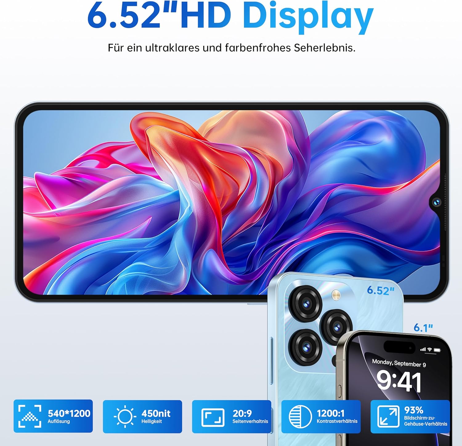 • 6,52-инчов HD+ IPS дисплей с капковидни цветове: 6,52-инчовият IPS дисплей с капковидни цветове и яркост от 450 нита осигурява детайлни, богати цветове и ясна видимост дори при пряка слънчева светлина. Плавното усещане и големият HD екран осигуряват завладяващо изживяване, независимо дали играете игри или гледате филми.