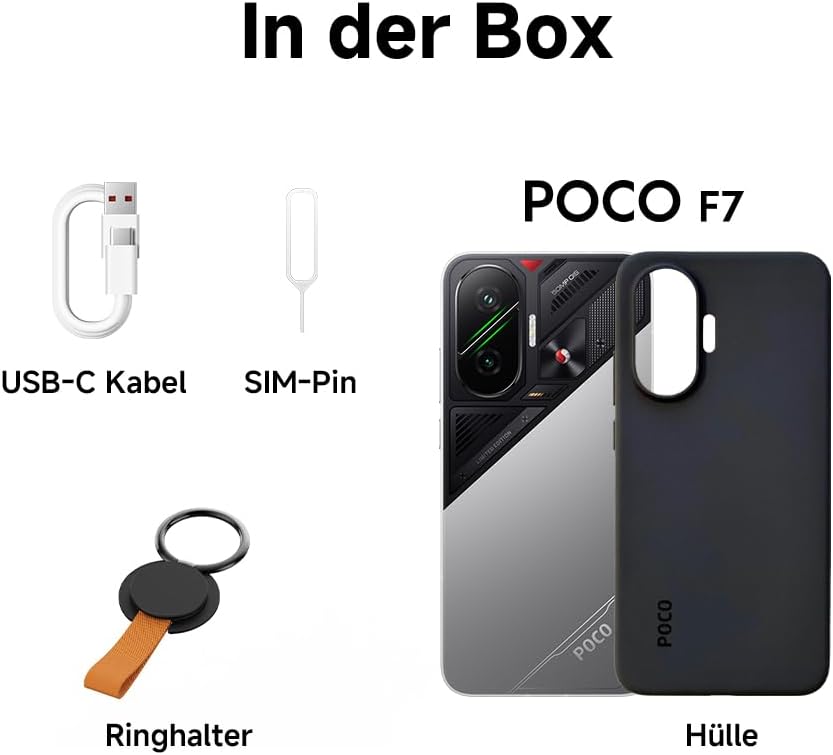 • Съдържание на кутията: 1x смартфон Poco F7, вградена батерия 6500 mAh, USB-C кабел, SIM пин, практичен пръстен за държач, защитен калъф, ръководство за потребителя и гаранционна карта - зарядното не е включено.