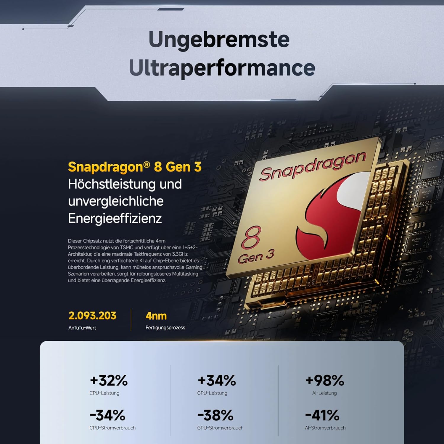 • УЛТРА БЪРЗА ПРОИЗВОДИТЕЛНОСТ Флагманската серия Snapdragon 8s Gen4 вече разполага с изцяло голяма ядрена архитектура, базирана на усъвършенствания 4nm процес на TSMC. С пикова тактова честота от 3,21 GHz, чипсетът осигурява изключителна производителност и се справя без усилие с взискателни задачи за плавно потребителско изживяване.