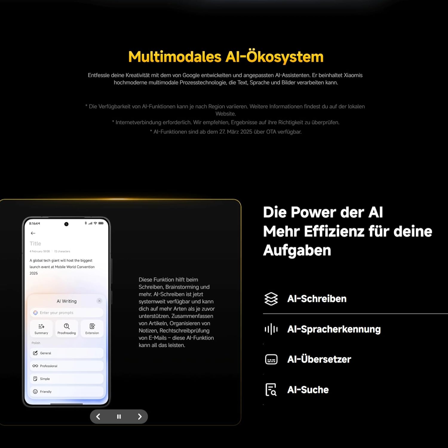 • Xiaomi HyperAI: Освободете креативността си с AI асистент, задвижван и персонализиран от Google. Той безпроблемно интегрира усъвършенстваната мултимодална технология за обработка на Xiaomi, която може без усилие да обработва текст, реч и изображения.