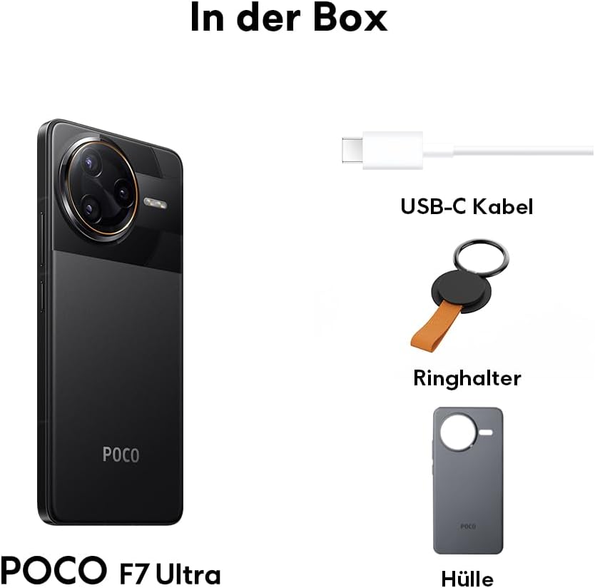 • Съдържание на кутията: 1x смартфон Poco F7, вградена батерия 6500 mAh, USB-C кабел, SIM пин, практичен пръстен за държач, защитен калъф, ръководство за потребителя и гаранционна карта - зарядното не е включено.