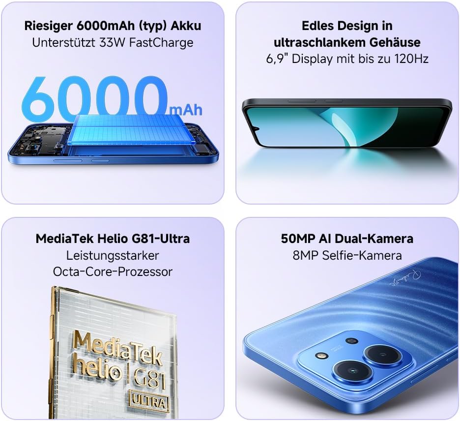 • Мощен осемядрен процесор - Постоянна и плавна работа: Процесорът MediaTek Helio G81 Ultra Octa-Core съчетава ниска консумация на енергия с висока производителност и по този начин осигурява плавно изживяване дори при продължителна употреба.