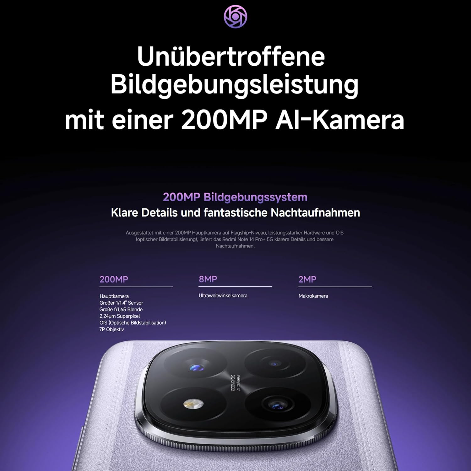 Смартфон Xiaomi Redmi Note 14 Pro+ 5G, 12 + 512 GB, лилав, 200 MP професионална AI камера, IP68, 120 W HyperCharge, AI функции (зарядното не е включено)