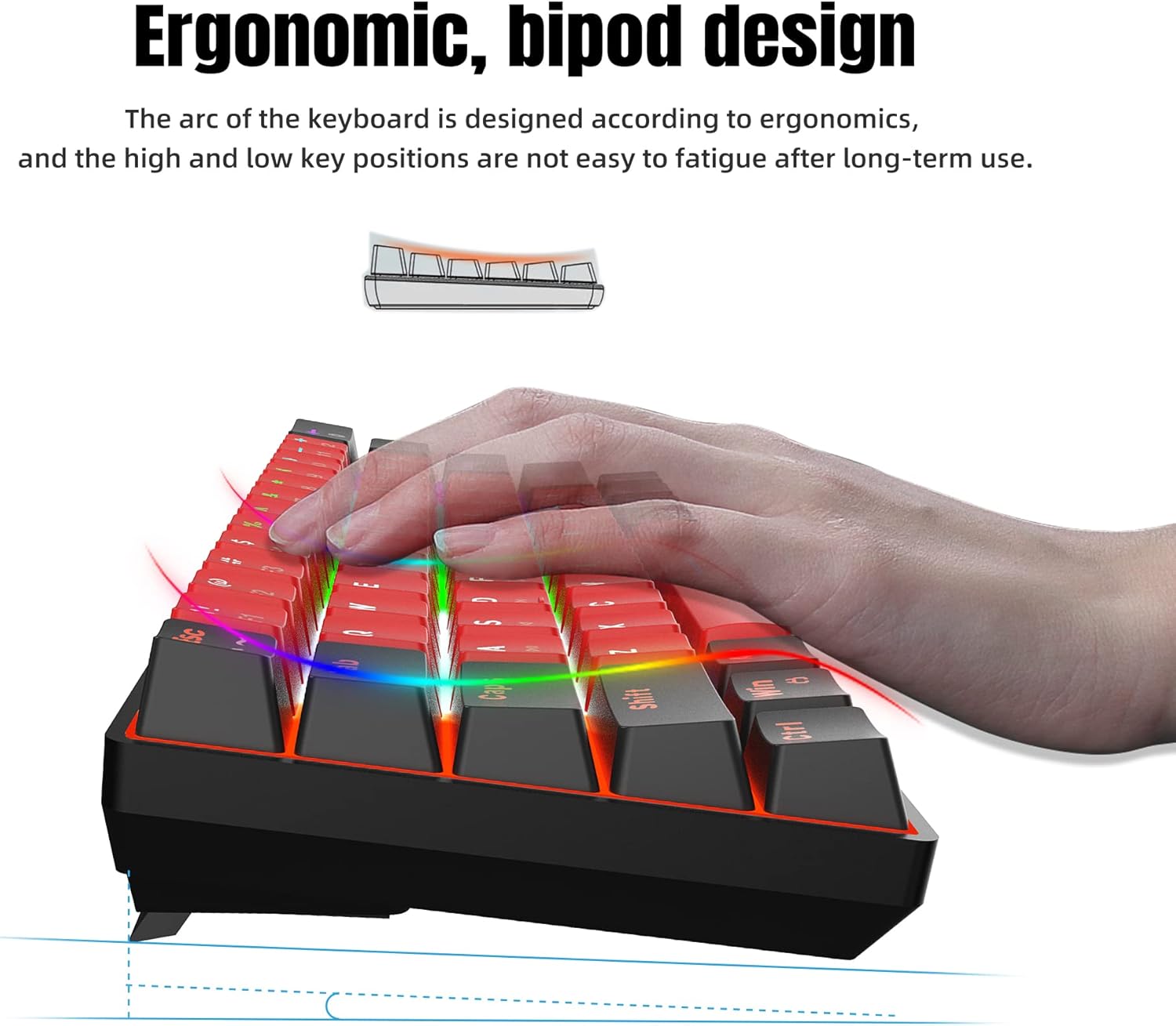 • Механична геймърска клавиатура с относително пълен набор от функции: при тази малка клавиатура всички клавиши са без конфликт, което е особено полезно за игри. Клавишите със стрелки, клавишите за сила на звука, мултимедийните клавиши, цифровите клавиши, клавишите със символи и др. не пропускат нормалните функции на клавиатурата поради по-малкия си размер и по-малко клавиши. А 20 вида ефекти осигуряват повече забавление при игра или писане през нощта.