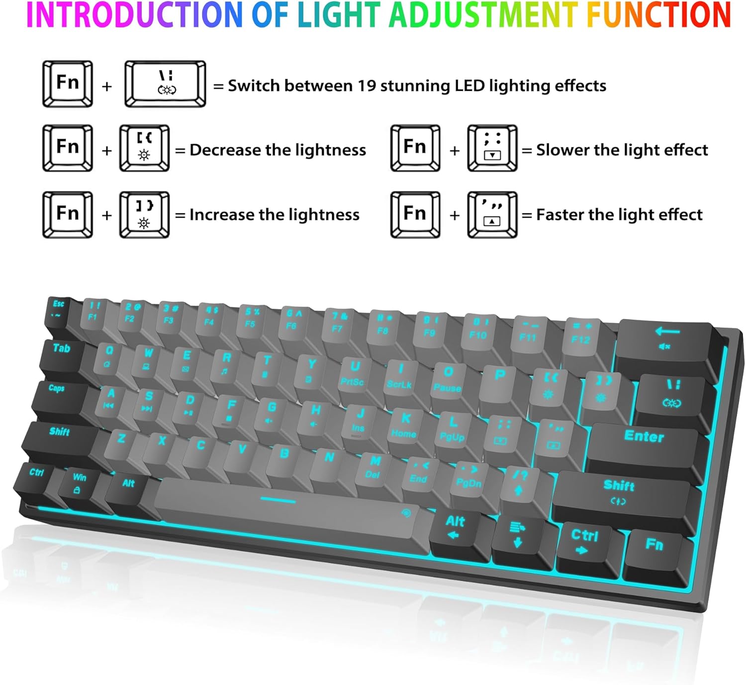 Snpurdiri 60% жична механична геймърска клавиатура, 61 Anti-Ghosting клавиша, синя LED подсветка, ултракомпактна, две стойки (червена дръжка/черно-сива)