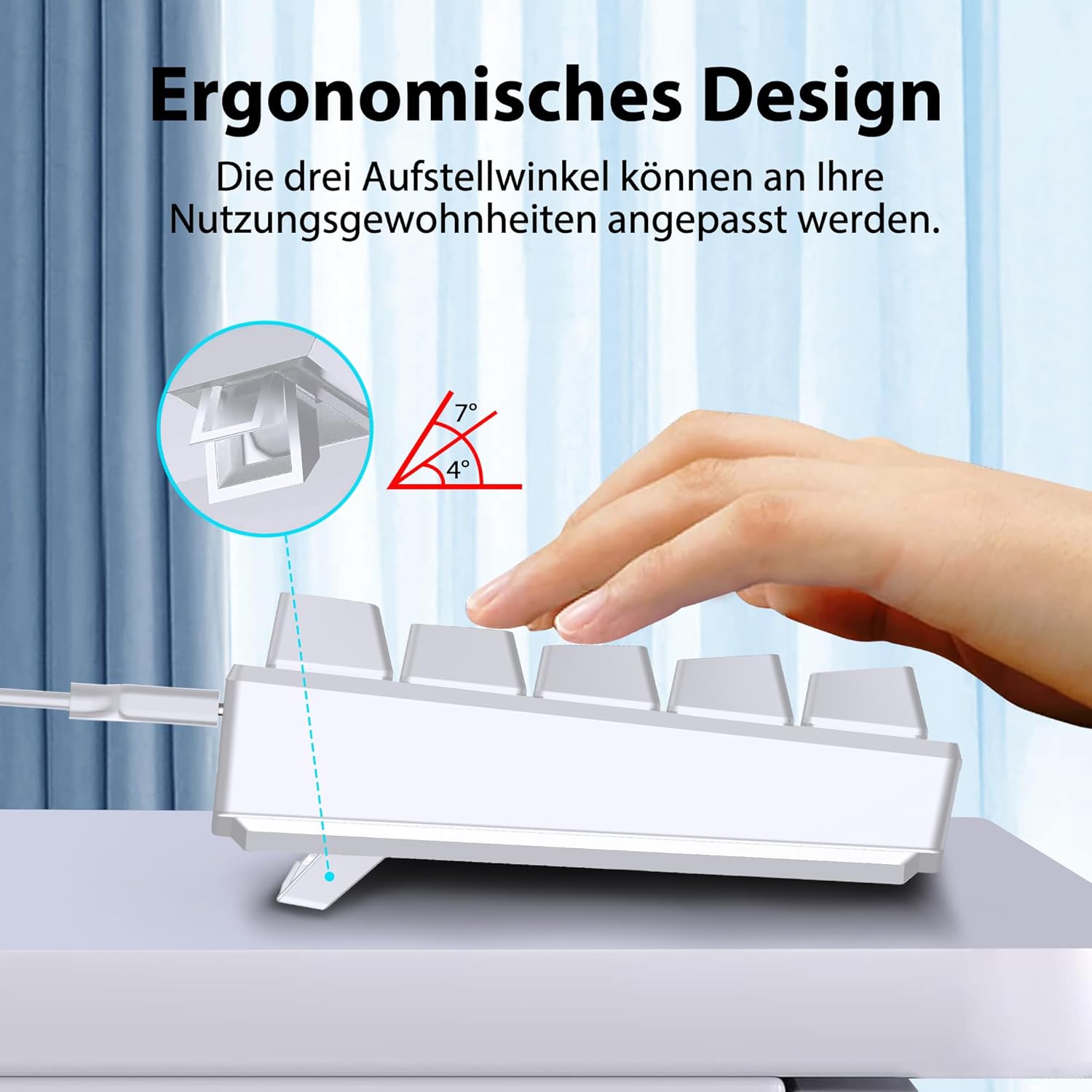 • Ергономичен дизайн за здраве: бялата механична клавиатура е проучена и проектирана въз основа на естествената форма на ръката, китката и структурата на лакътя. Ергономичен дизайн с високи и ниски бутони, двойна стойка - всичко това поддържа ръката ви в възможно най-естествено състояние, за да се сведе до минимум умората след продължителна употреба. Интерфейсът Type-C с възможност за включване също прави свързването лесно и удобно за носене.