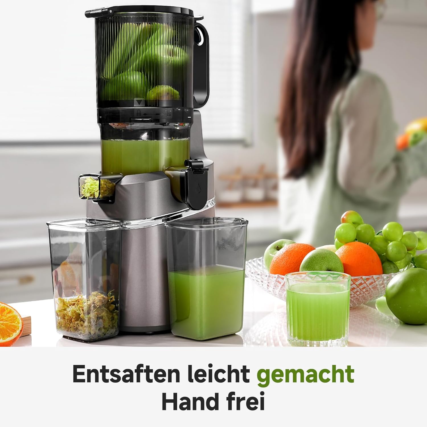 Сокоизстисквачка AMZCHEF Slow Juicer - Победител в теста за цели плодове и зеленчуци, XXL отвор 135 мм, без BPA с книга с рецепти - контейнер 1,8 л, троен филтър, сив
