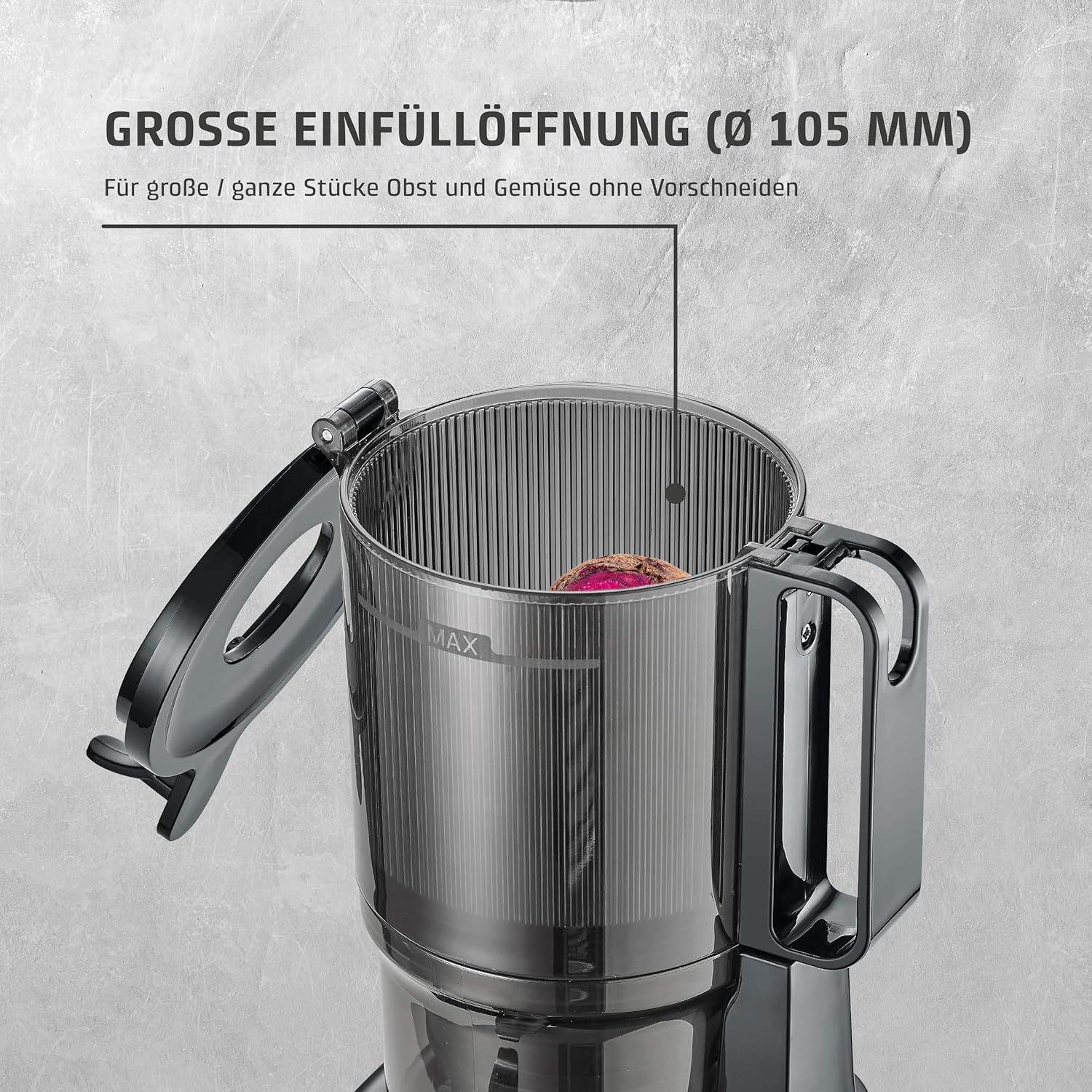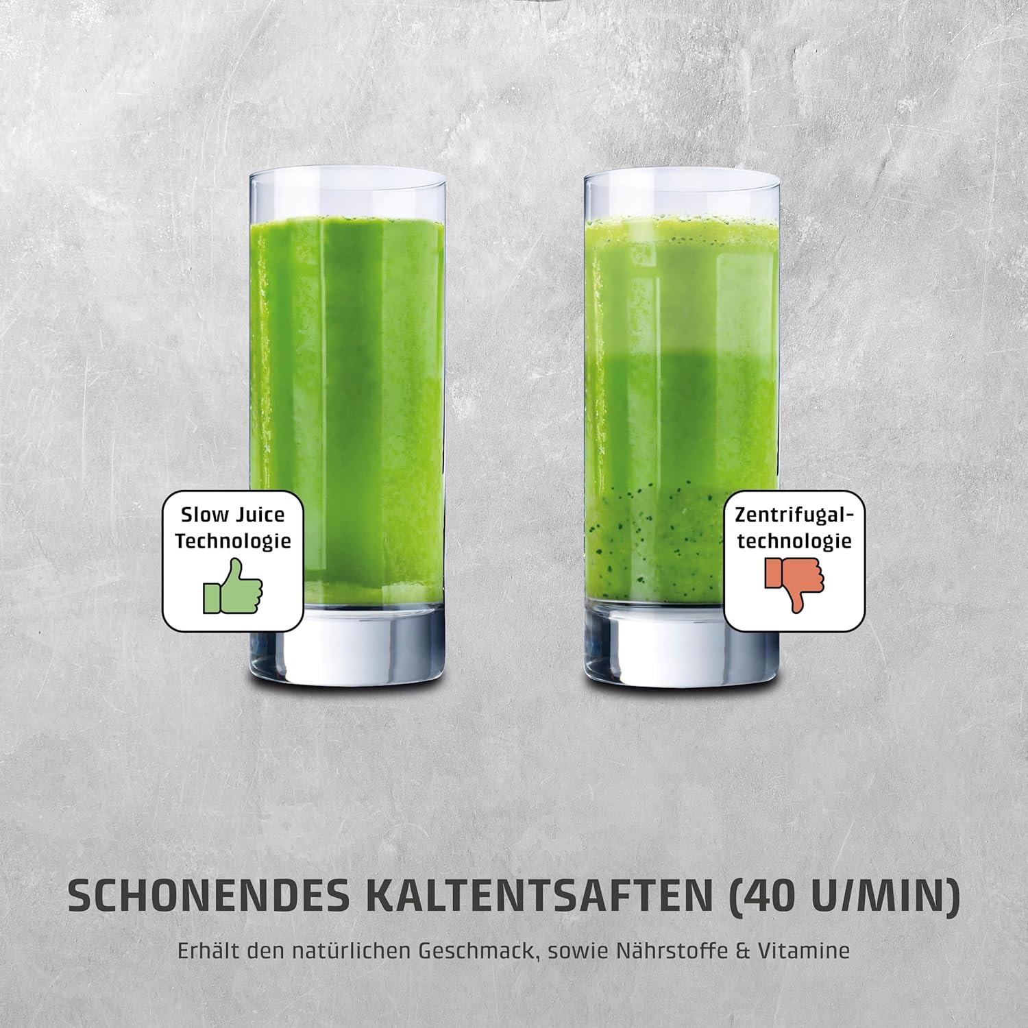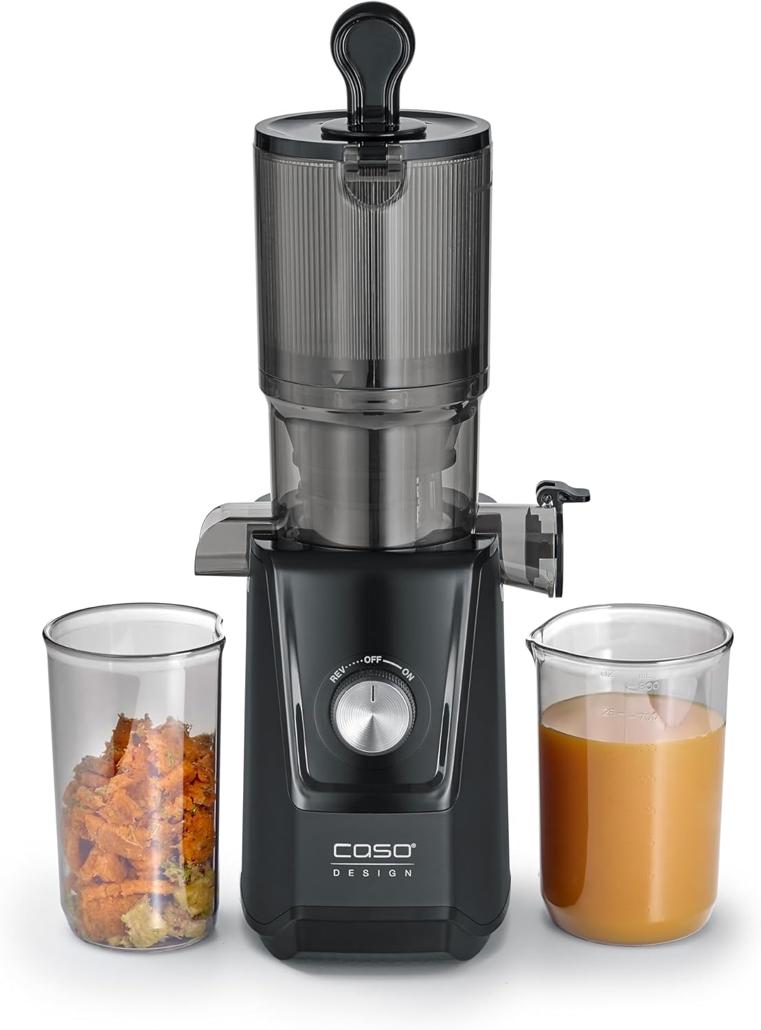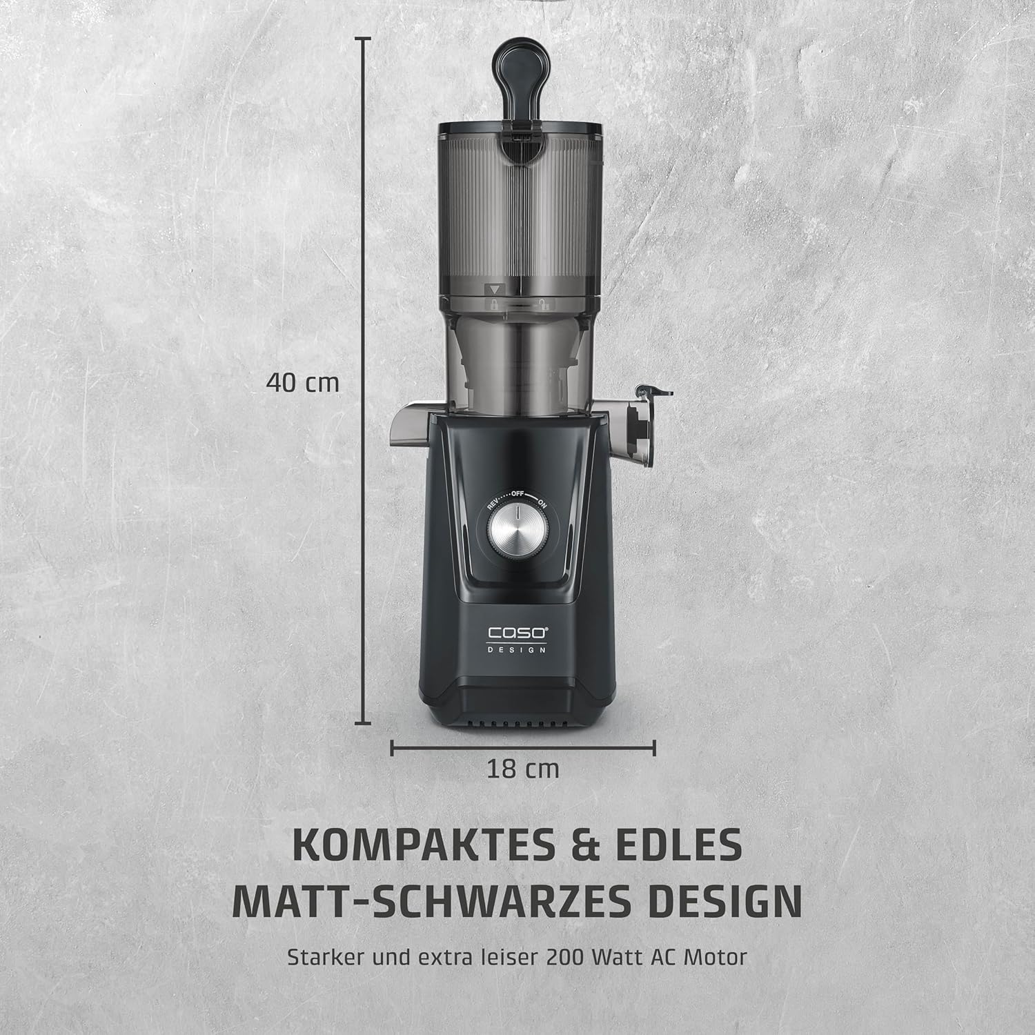 Сокоизстисквачка CASO Juice Fit Slow, Сокоизстисквачка, Нежно изцеждане благодарение на ниската скорост на въртене (40 об/мин), Голям отвор за пълнене с диаметър 105 мм, Сокоизстисквачка за плодове, зеленчуци, Без BPA