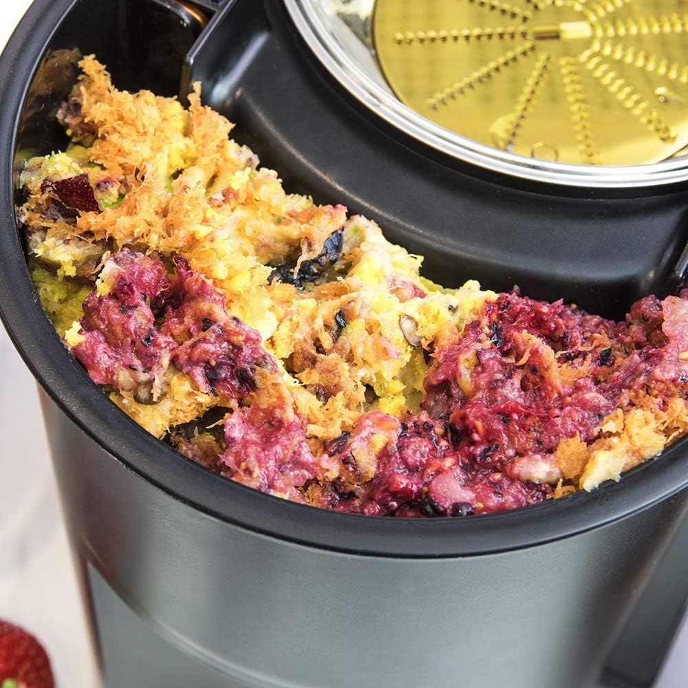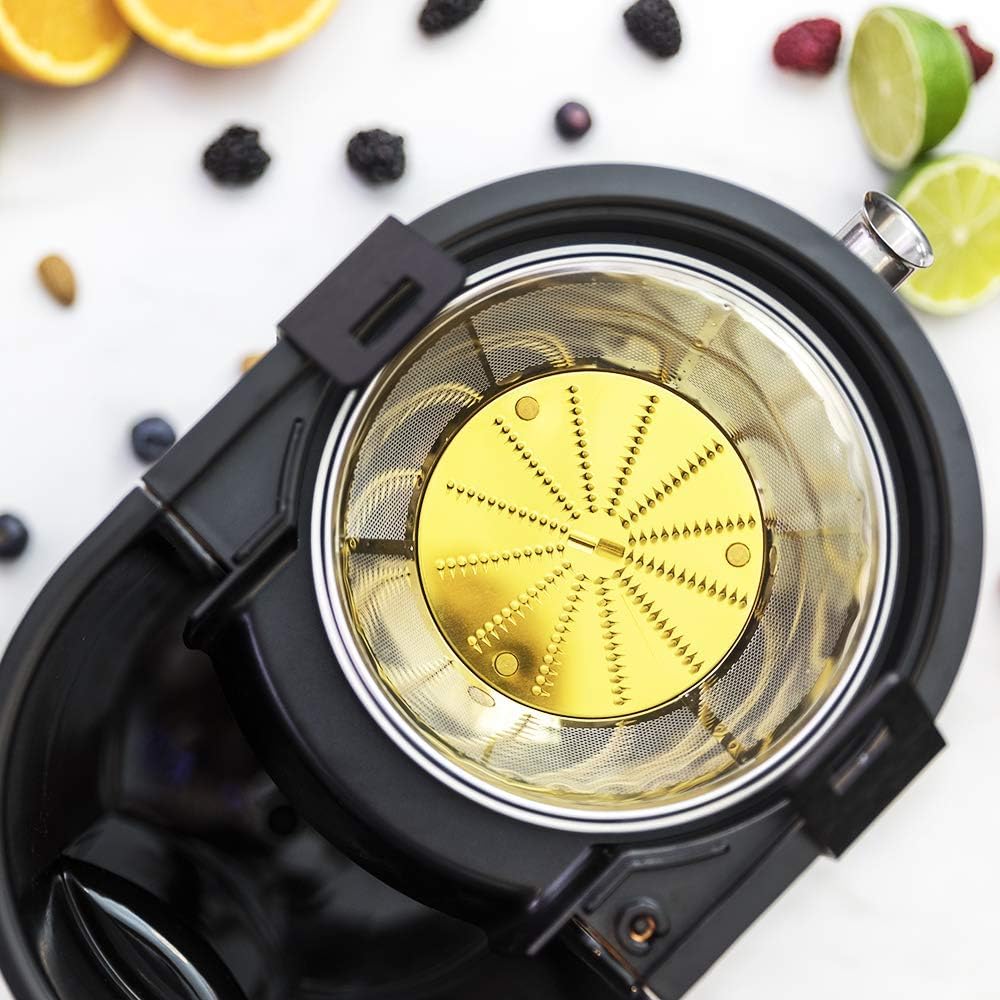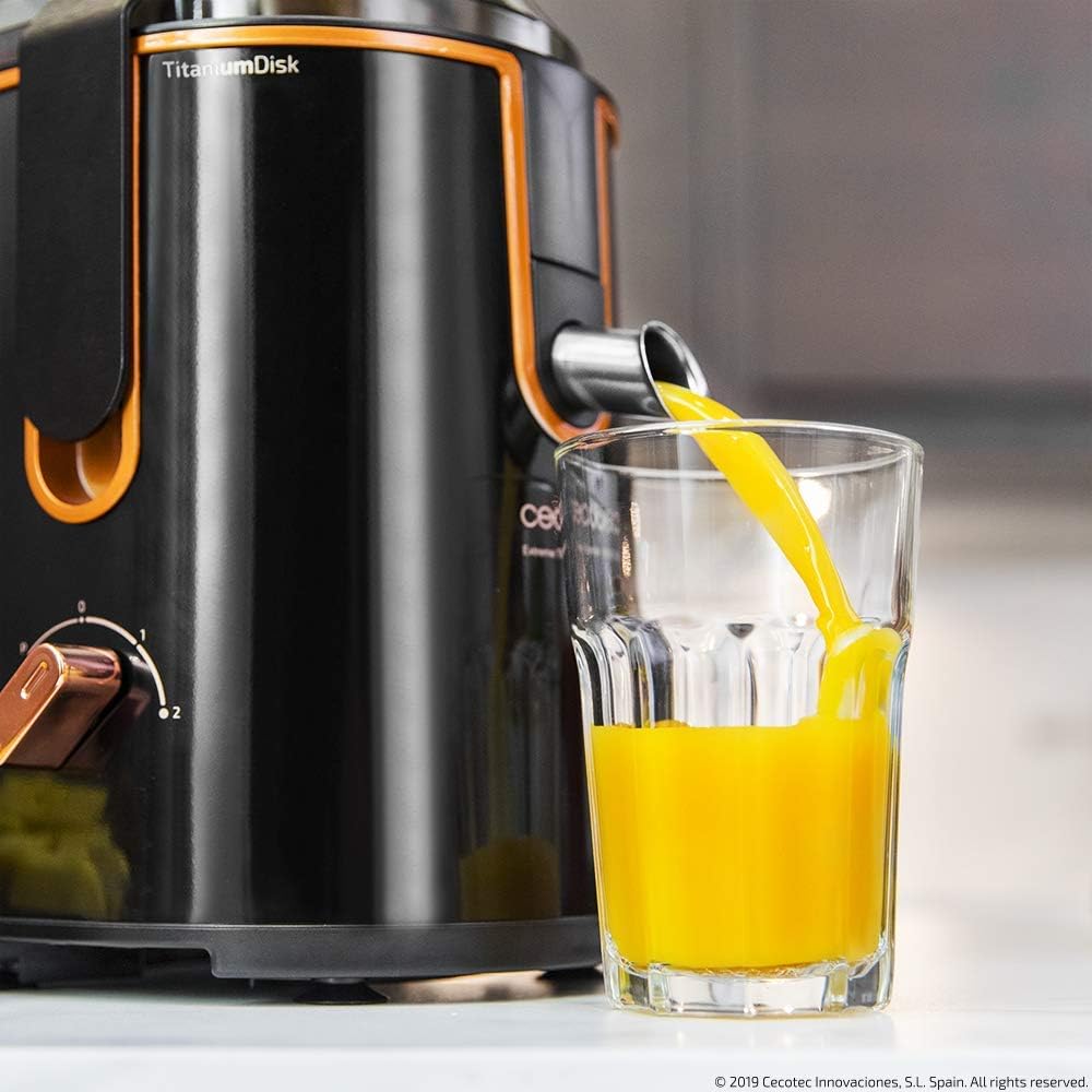 Орбитален блендер за изцеждане на плодове и зеленчуци с максимална мощност 1300 W за постигане на перфектни резултати. Диск с титаниево покритие, което подобрява твърдостта и поддържа по-дълготрайната острота. XXL 75 мм канал за поставяне за поставяне на цели плодове и зеленчуци. Благодарение на дизайна си и скоростта от 19 000 оборота в минута, той използва плодовете по-добре и извлича до 30% повече витамини. 2 скорости, за да се адаптира към всички храни. Компактен дизайн с вграден резервоар за пулп с капацитет 2000 мл в корпуса. Включва кана за сок от 32 унции (946 мл). Без BPA, нетоксична пластмаса. Лесен за почистване. Неелектрически части, подходящи за съдомиялна машина. Система за безопасност, която позволява работа само когато миксерът е правилно сглобен. Чучур против прокапване. Неплъзгаща се основа и отвор за съхранение на кабела.