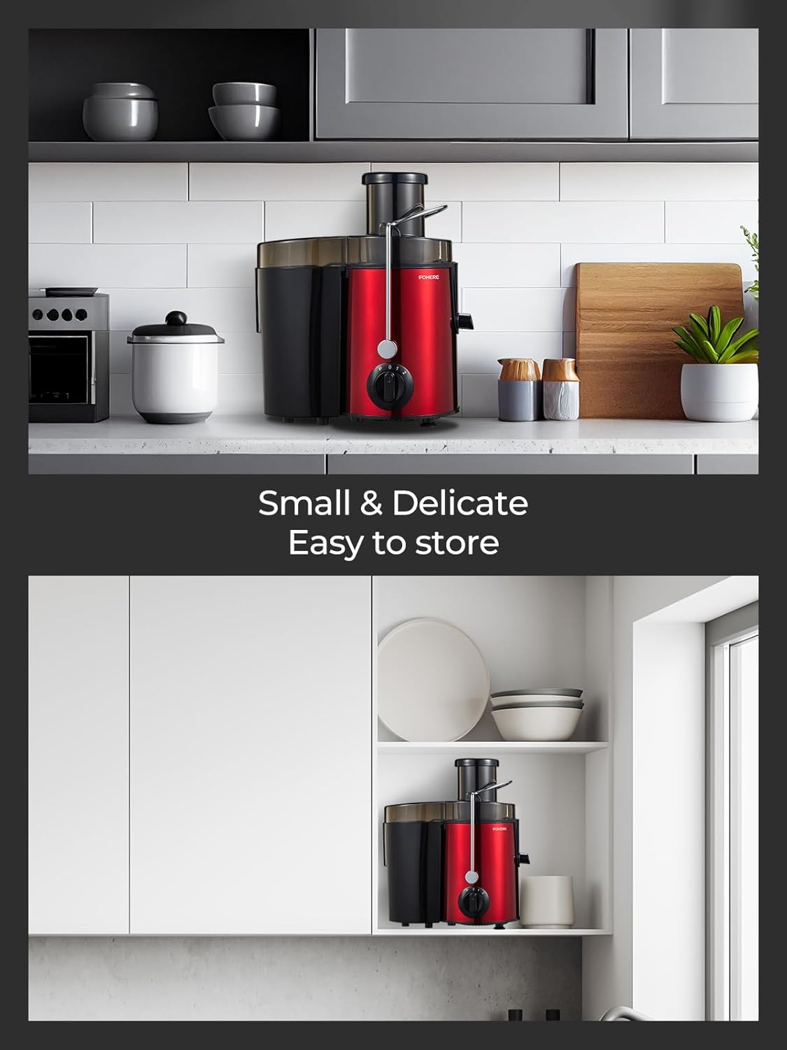 Сокоизстисквачка FOHERE за плодове и зеленчуци от неръждаема стомана, центробежна сокоизстисквачка 400 W, отвор за пълнене 65 мм и 3 скорости, функция против прокапване и защита от прегряване, включително четка за почистване, червена