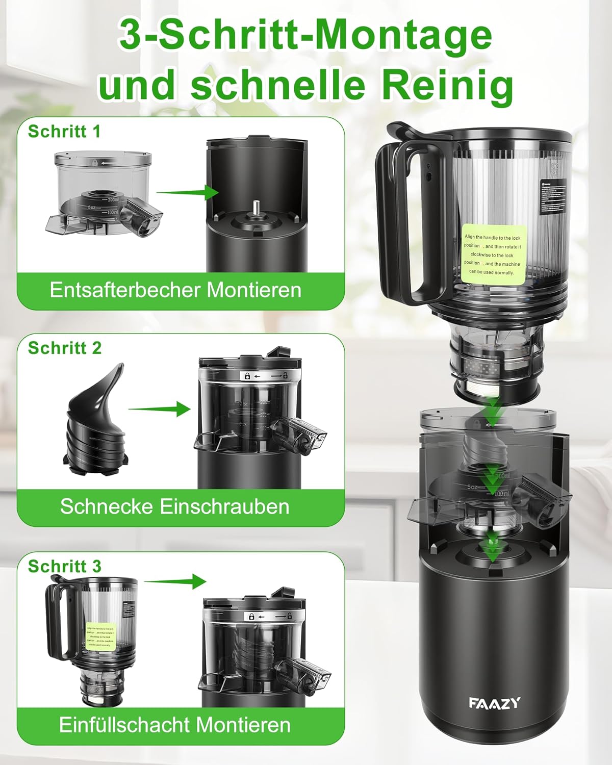 • Лесно почистване: сокоизстисквачката се състои само от три основни части, които могат лесно да се разглобят. С включената четка можете да отстраните остатъците без усилие. Независимо дали става въпрос за плодове или зеленчуци - вашата практична сокоизстисквачка е готова за употреба отново за нула време.