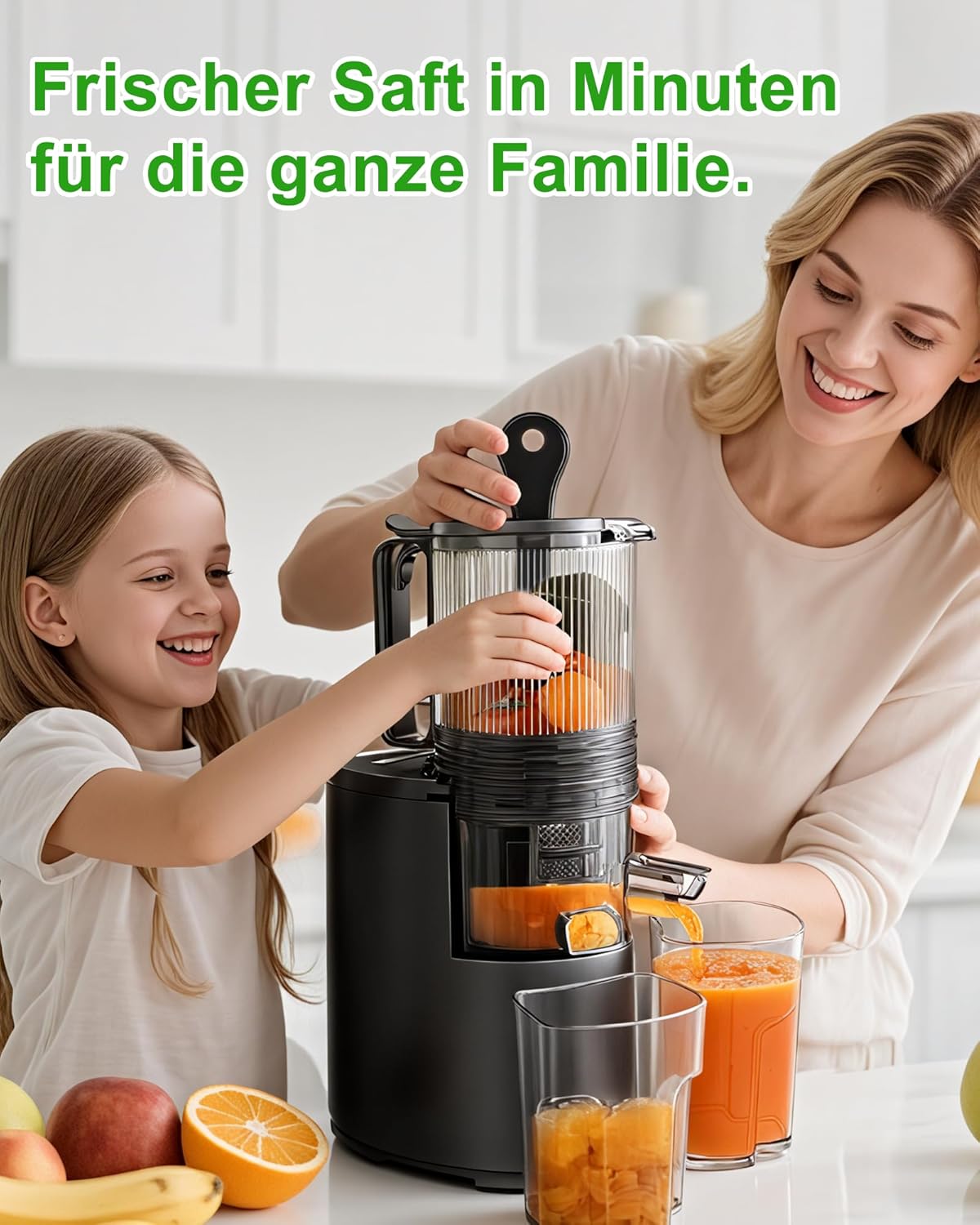 • 160 мм тръба за подаване на хляб: изключително твърдият шнек за пресоване гарантира, че дори цели ябълки и зеленчуци се обработват ефективно. С отвор с ширина 130 мм можете лесно да пълните цели плодове без предварително нарязване. Тази сокоизстисквачка с разклащане прави изцеждането на сок особено лесно и спестява време в ежедневието - отлична алтернатива на ръчната сокоизстисквачка.