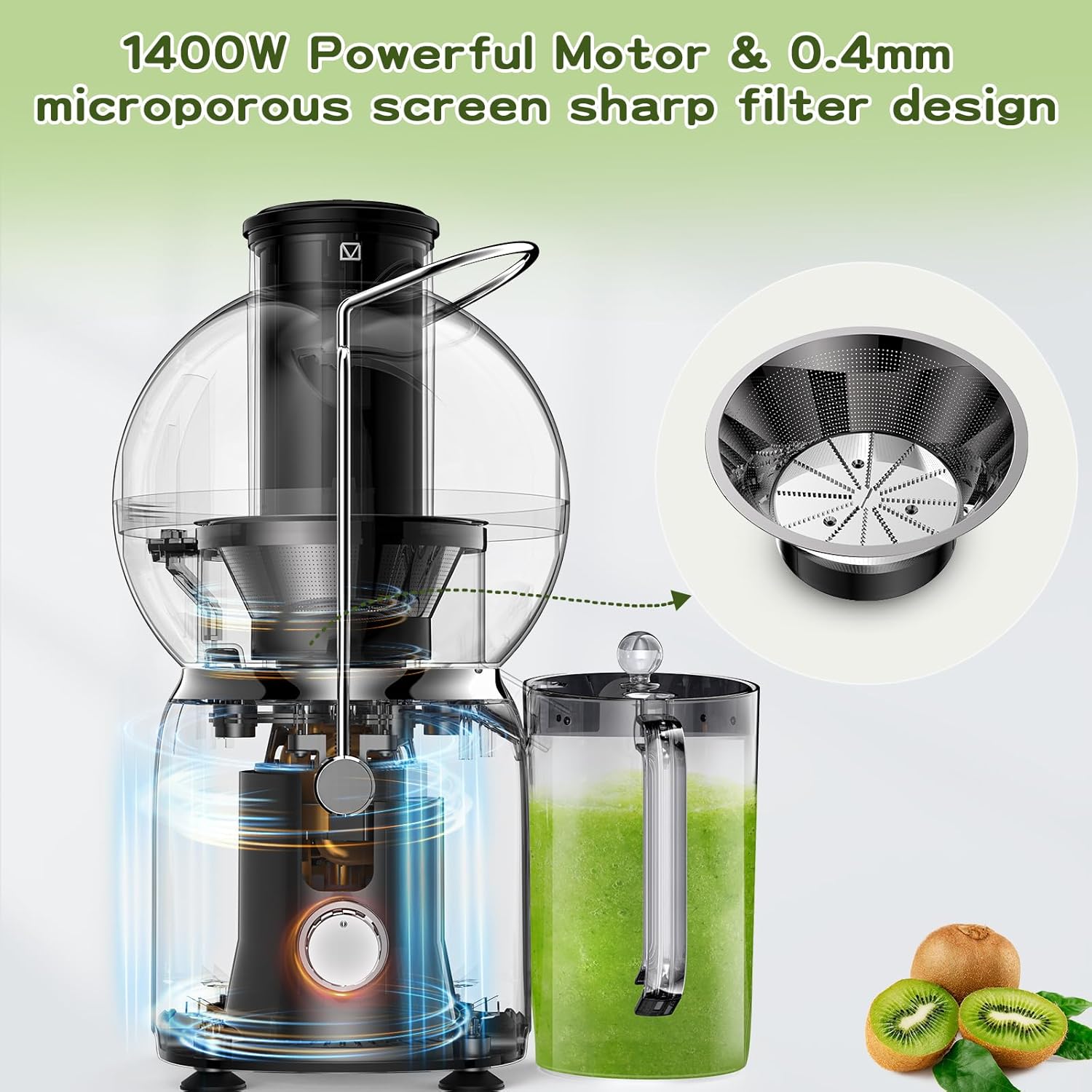The juicer is equipped with a 1400 watt motor and sharp food grade blades that can extract the juice from the fast-spinning pulp in seconds - 20% faster than other juicers. And low noise, efficient
