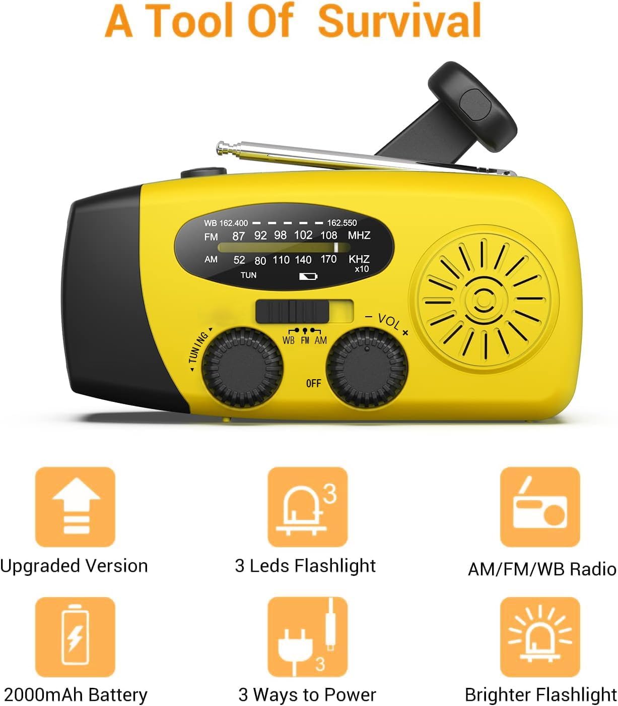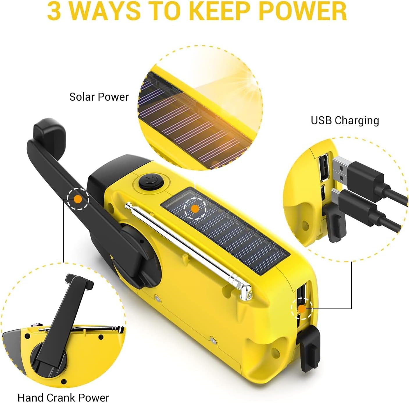 3 ярко бели светодиода FM/AM/NOAAC Зареждане на мобилен телефон при спешни случаи. Защита от зареждане и разреждане. Няколко начина за захранване на безжичната фенерче: Ръчна манивела за навиване, излагане на вътрешността на алтернатор/слънчева светлина. Зареждане чрез USB DC 5V, свързване на устройството към компютъра с USB кабел Водоустойчивост IPX3
