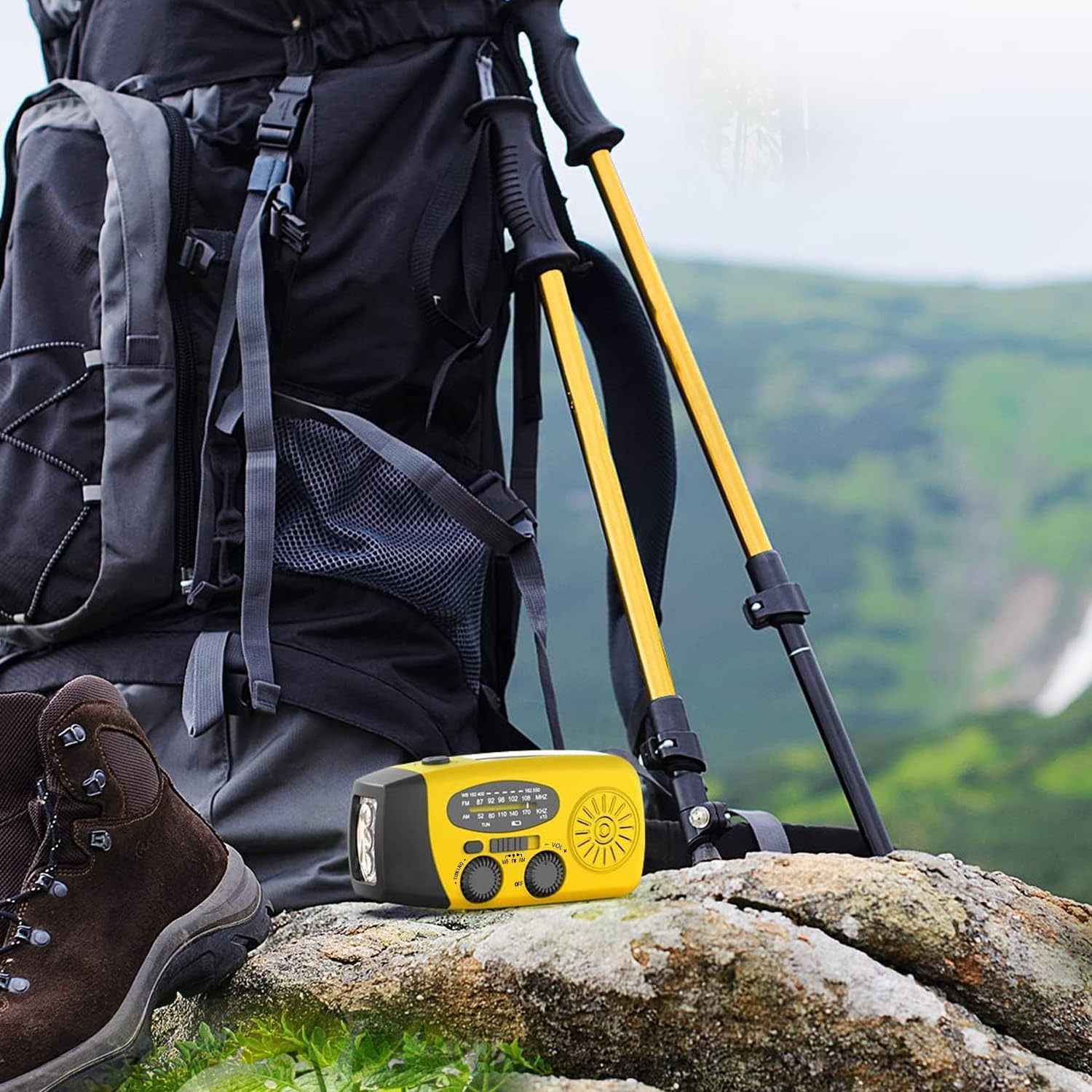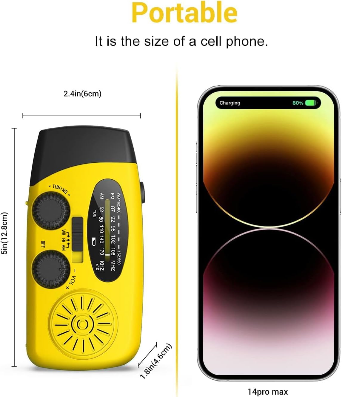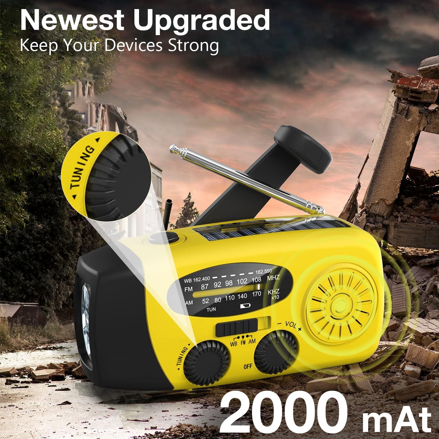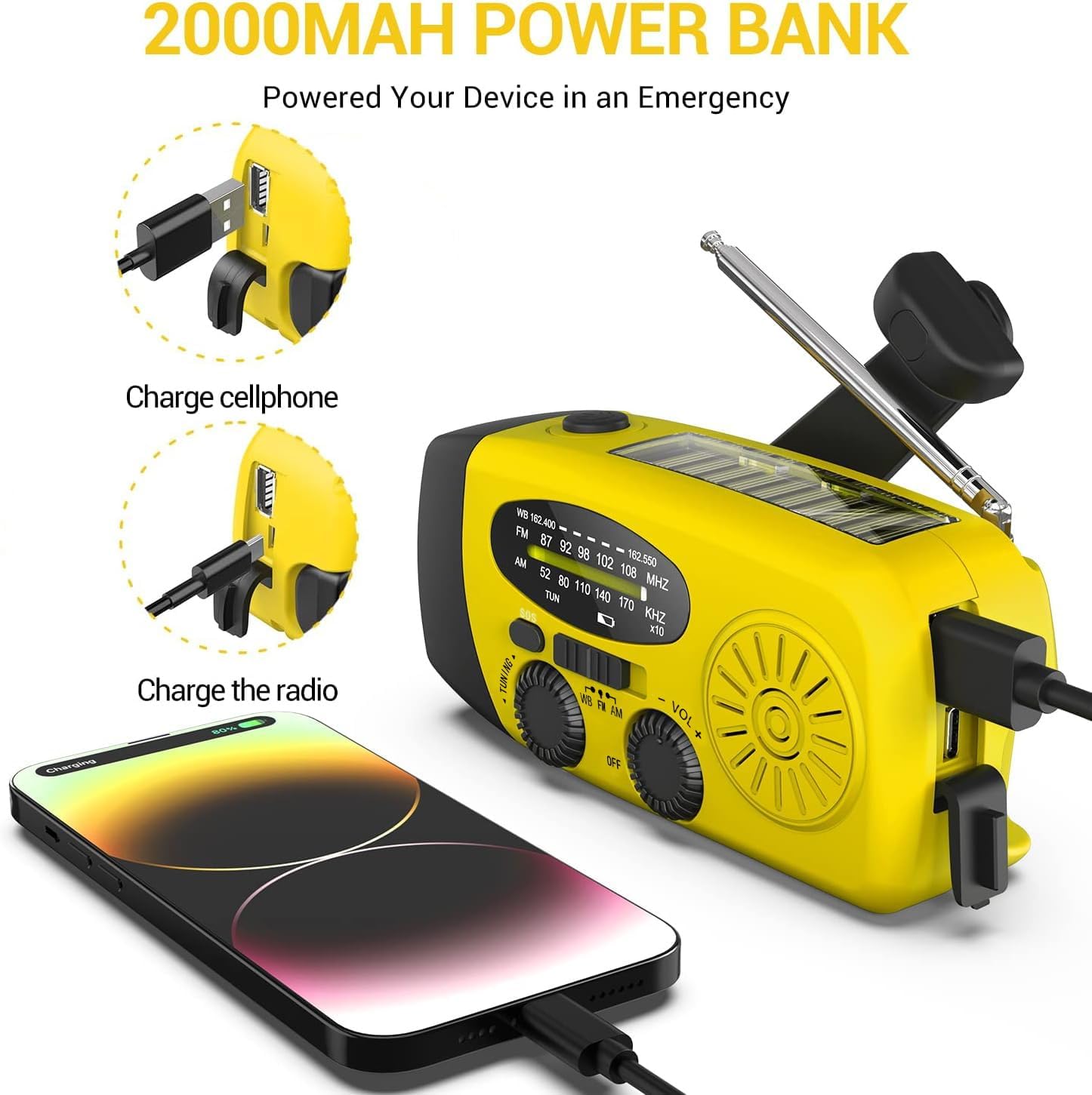 The radio has a small generator inside. Turn the crank to charge the radio. This method can power your radio in any case. It does not need much force to turn the crank, which can be easily carried out by experienced people and children