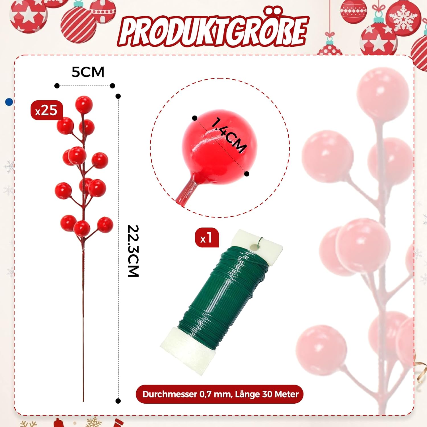 2. СЪДЪРЖАНИЕ НА ПАКЕТА - Ще получите 25 яркочервени изкуствени клонки от плодове и ролка тънка зелена тел - достатъчни за разнообразни коледни декорации.