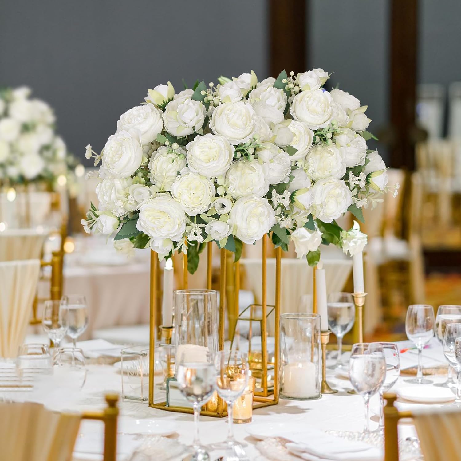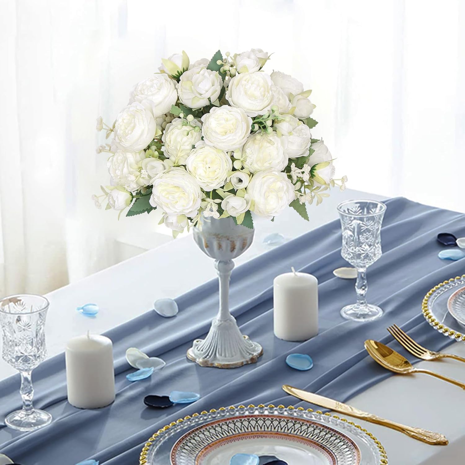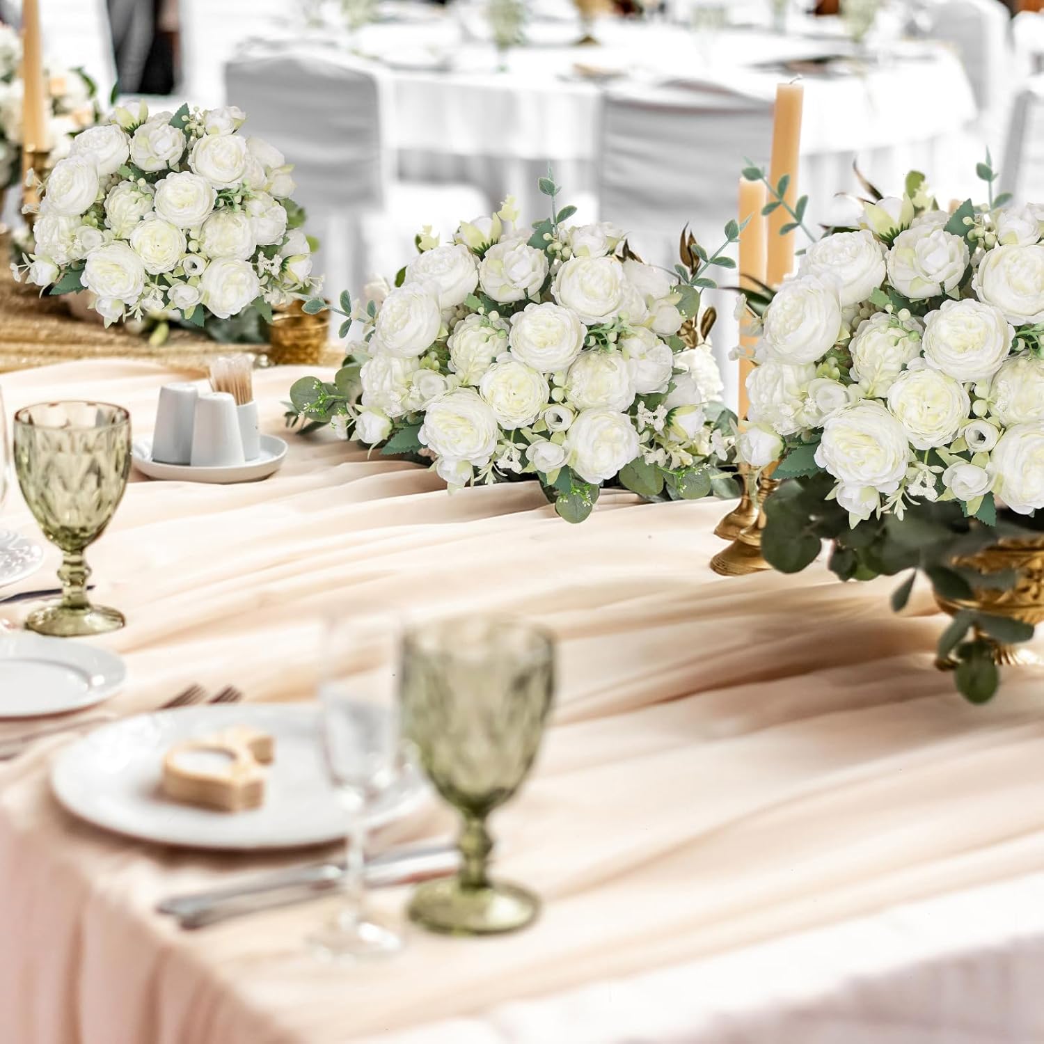 SOMYTING Божури Изкуствени цветя 2 връзки Букет от изкуствени божури Бели цветя Букети от копринени божури за сватбено тържество Топпери за маса Цветна аранжировка Декор за дома и кухнята