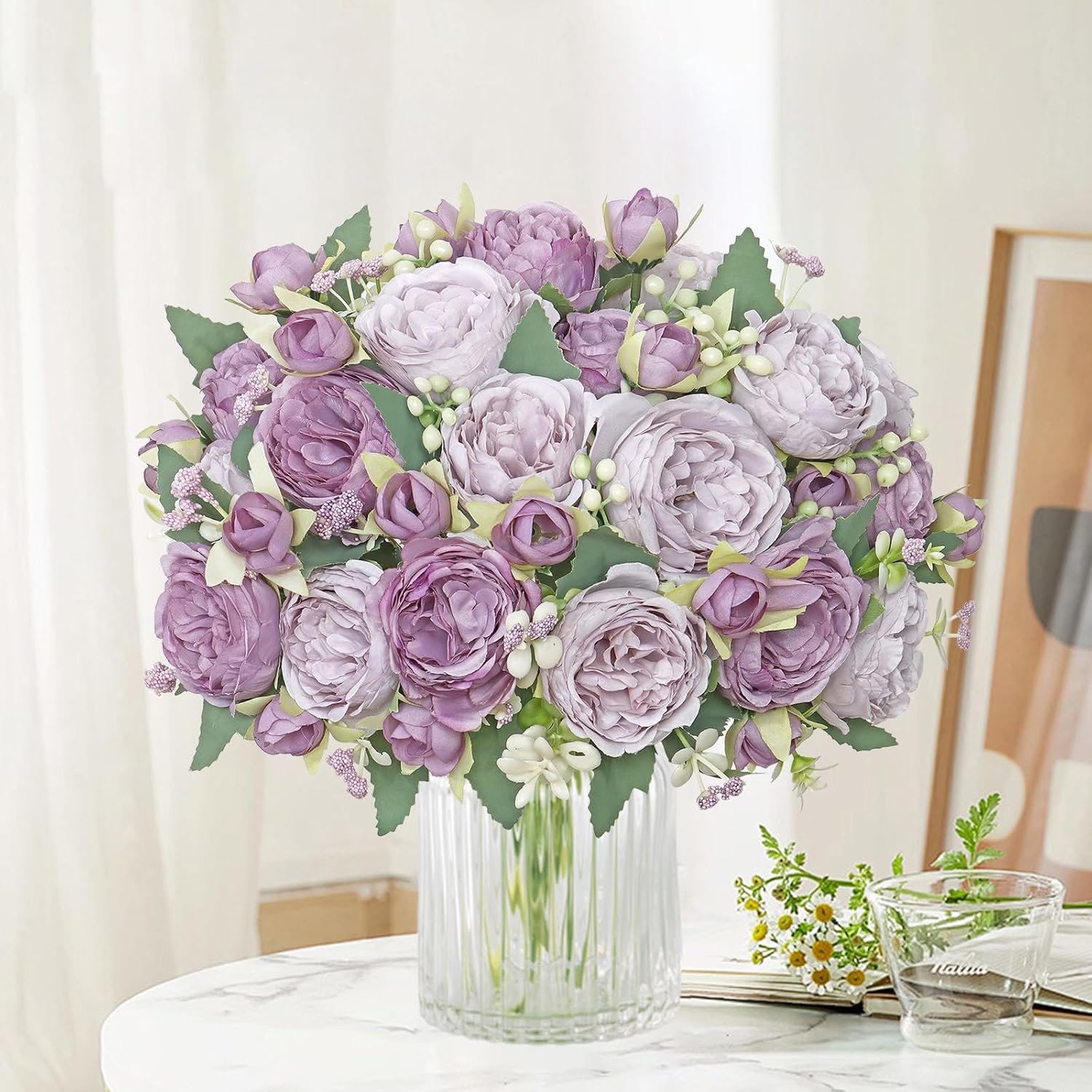 • ВКЛЮЧЕН ПАКЕТ С ИЗКУСТВЕНИ ЦВЕТЯ С БОЖУРИ: комбинация от един букет изкуствени цветя (вазите не са включени): има 2 връзки изкуствени божури. Всеки букет има 5 клонки, общо 5 големи цвята божури, 4 малки цвята божури и няколко пенести връхчета на цветовете и плодове. Обща височина приблизително 31 см / 12 инча.