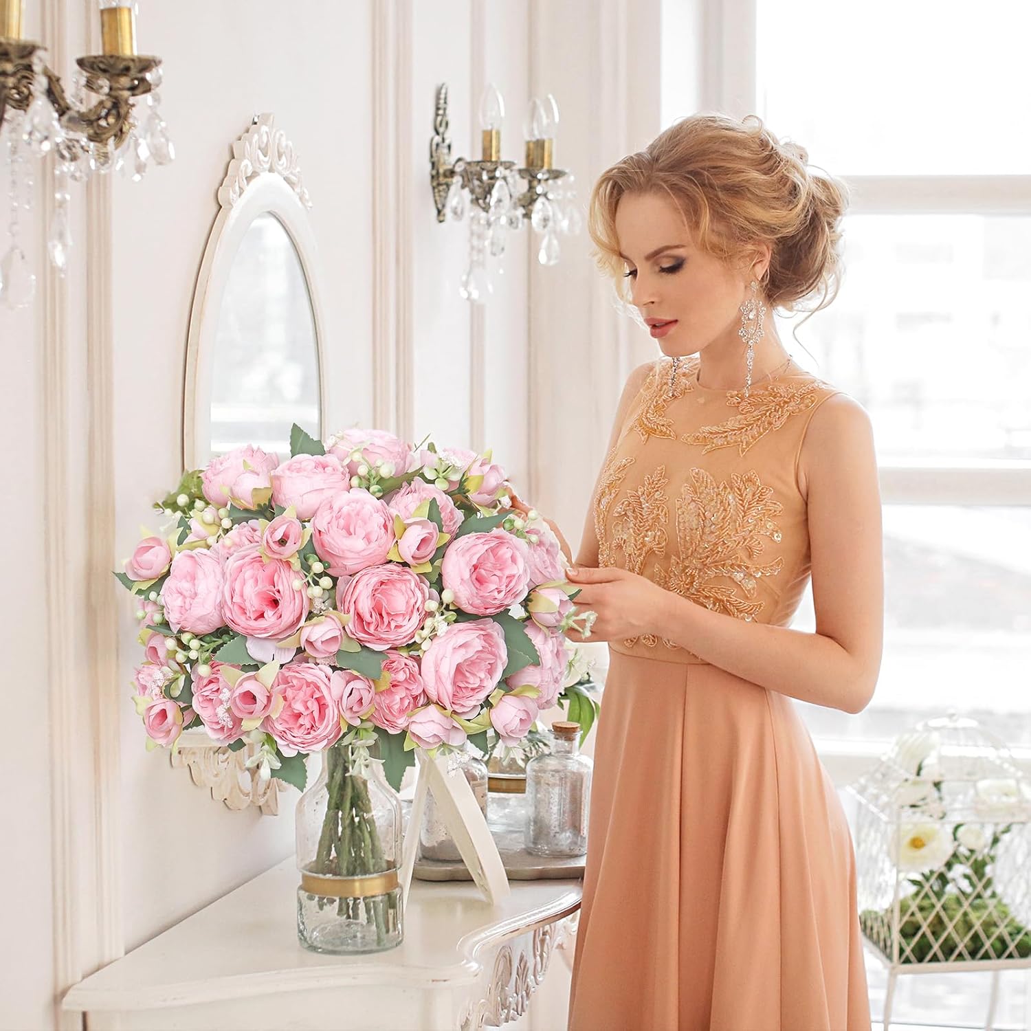 • РОЗОВИ ЦВЕТЯ ЗА ЦВЕТНА ДЕКОРАЦИЯ: Романтичен партньор в живота: символиката на изкуствените божури е благоприятна и богата, романтична и елегантна, грациозна и луксозна. Този букет от божури създава романтична и весела атмосфера за вашия дом, сватба или парти, което е много подходящо за декорация на маса за трапезария, декорация на маса за хол, модерен декор за селски дом и коледна украса.
