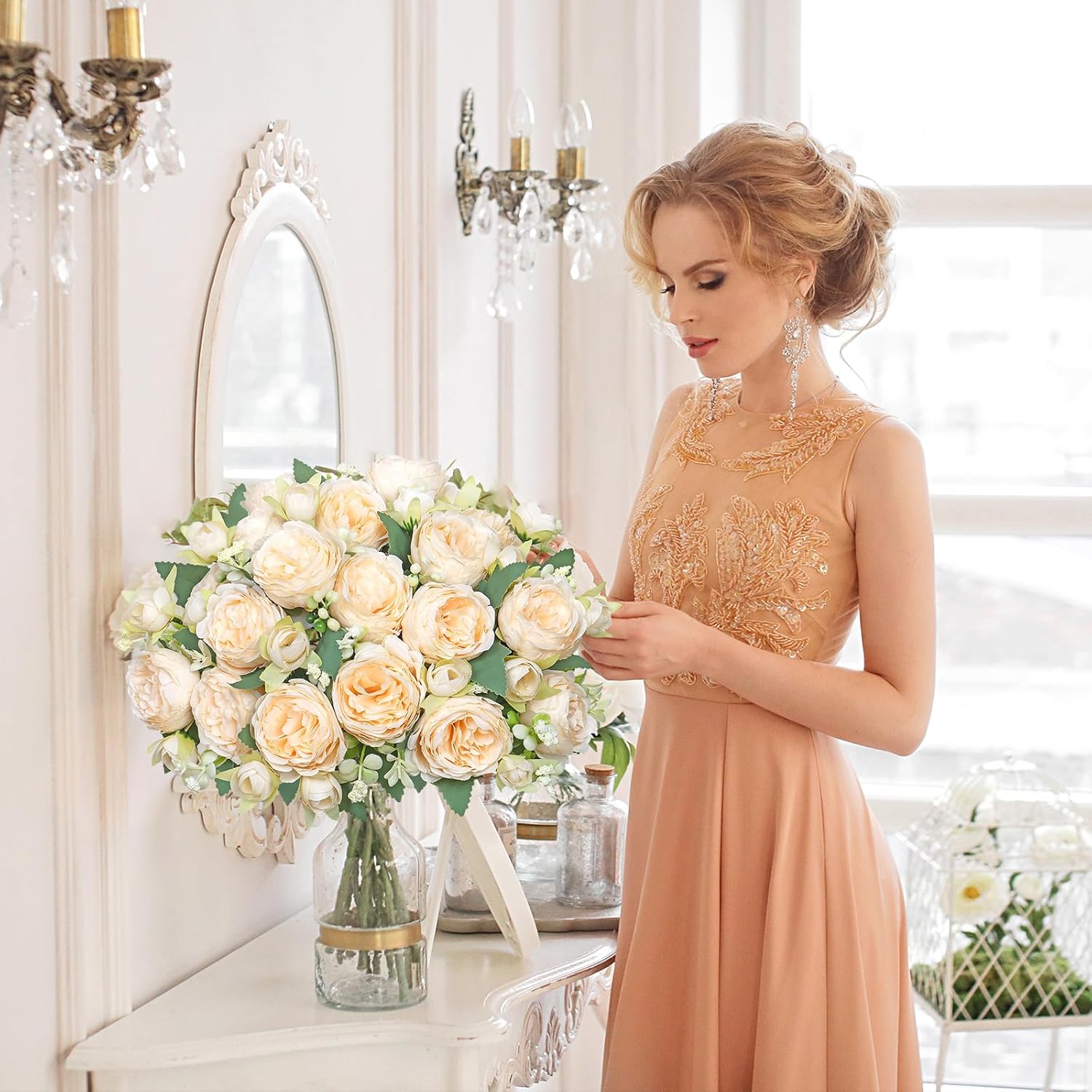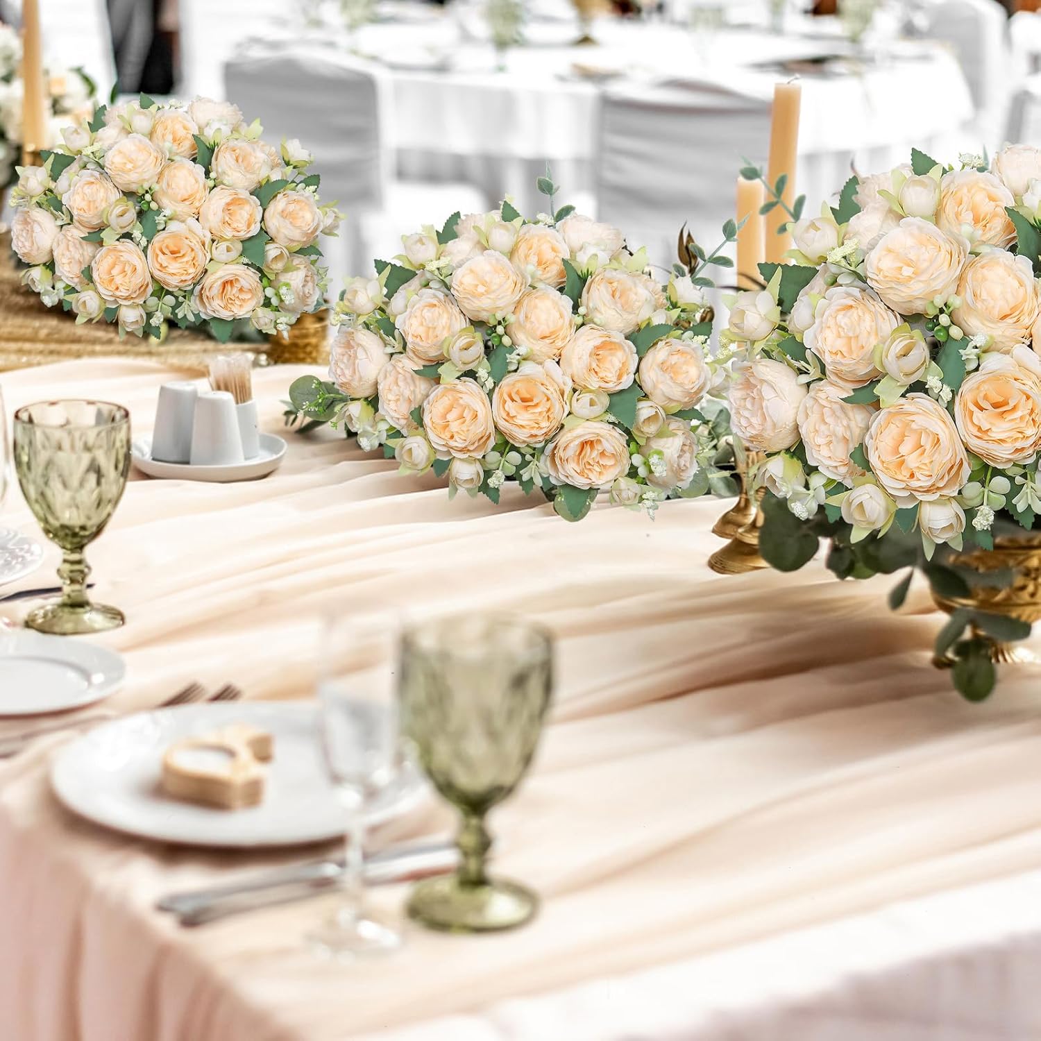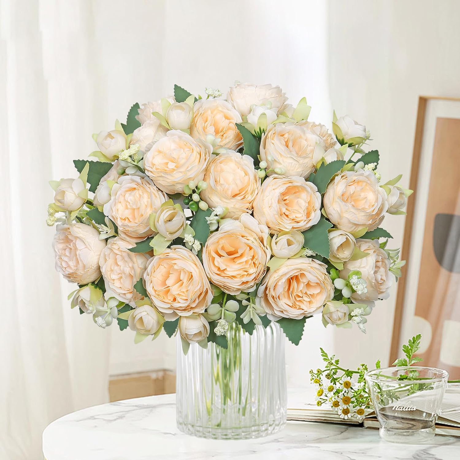 • ЛЕСНА ПОДДРЪЖКА КОПРИНЕНИ БОЖУРИ: Дълготрайно красиви и лесни за почистване: тези реалистични копринени цветове на божури са ярки и красиви през цялата година, могат да ви спестят поливане, резитба и други проблеми; Идеални са за декорация на кухненска маса, декорация на маса в спалня, рустик домашен декор.