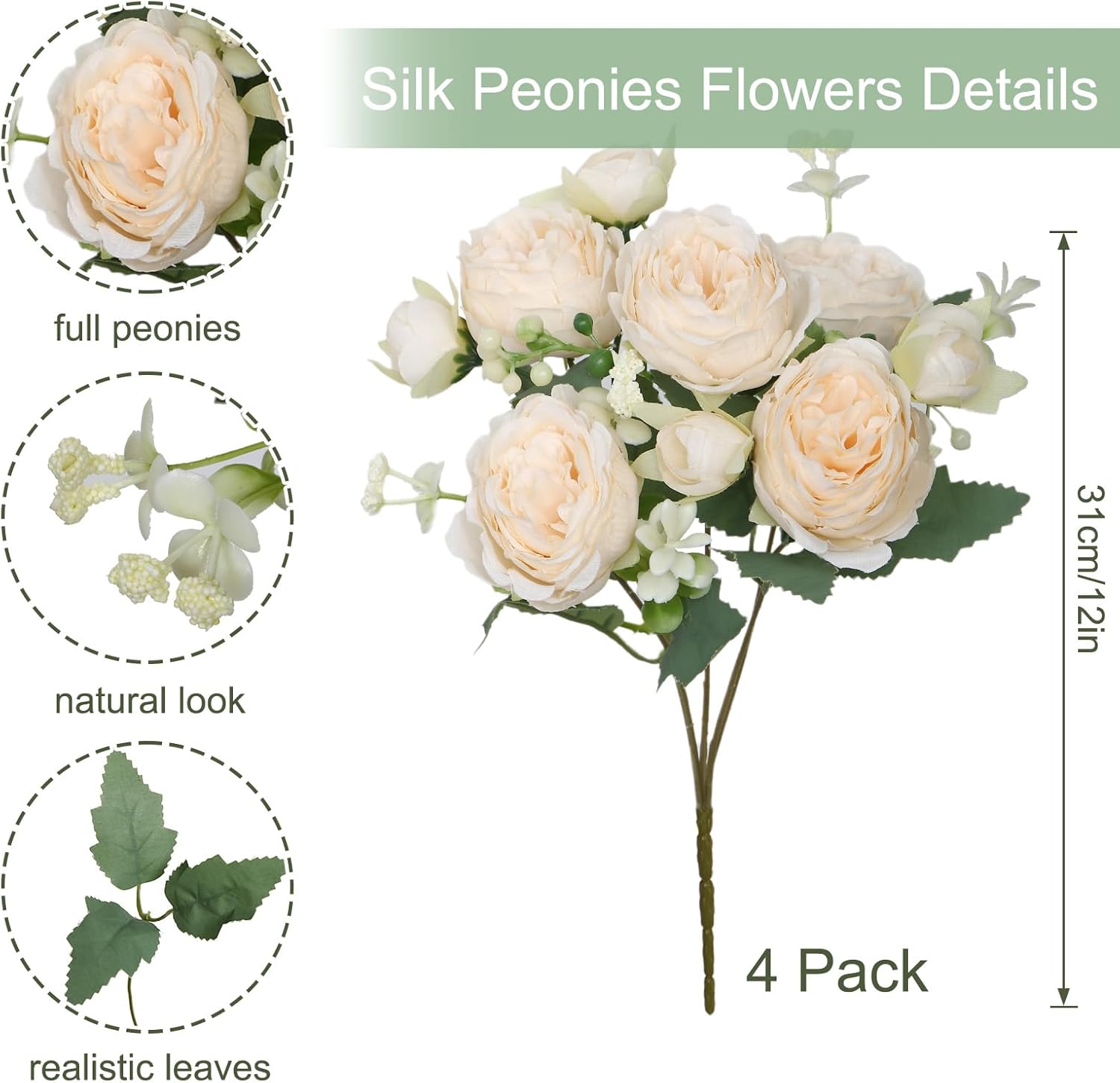 • ВКЛЮЧЕН ПАКЕТ С ИЗКУСТВЕНИ ЦВЕТЯ С БОЖУРИ: комбинация от един букет изкуствени цветя (вазите не са включени): има 2 връзки изкуствени божури. Всеки букет има 5 клонки, общо 5 големи цвята божури, 4 малки цвята божури и няколко пенести връхчета на цветовете и плодове. Обща височина приблизително 31 см / 12 инча.