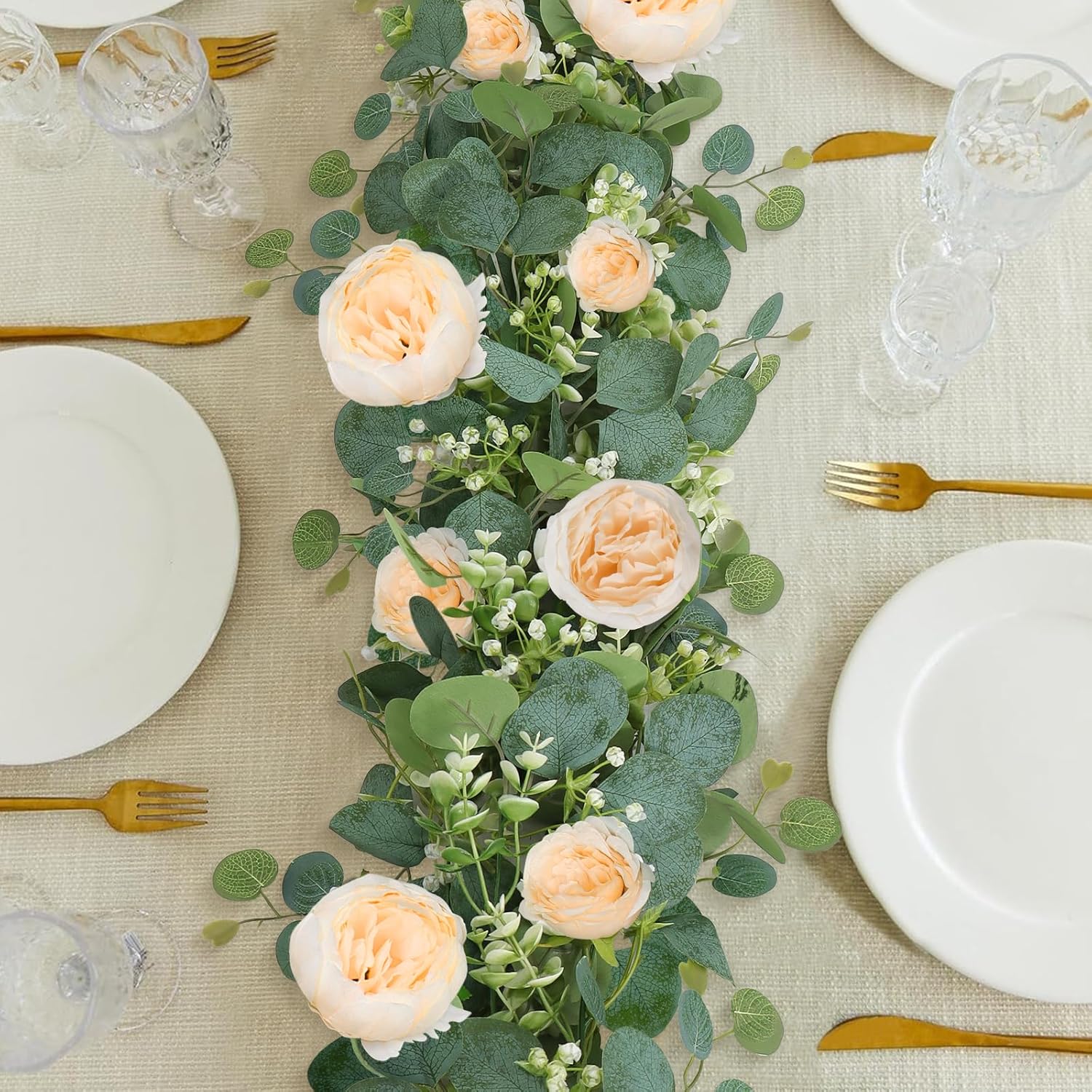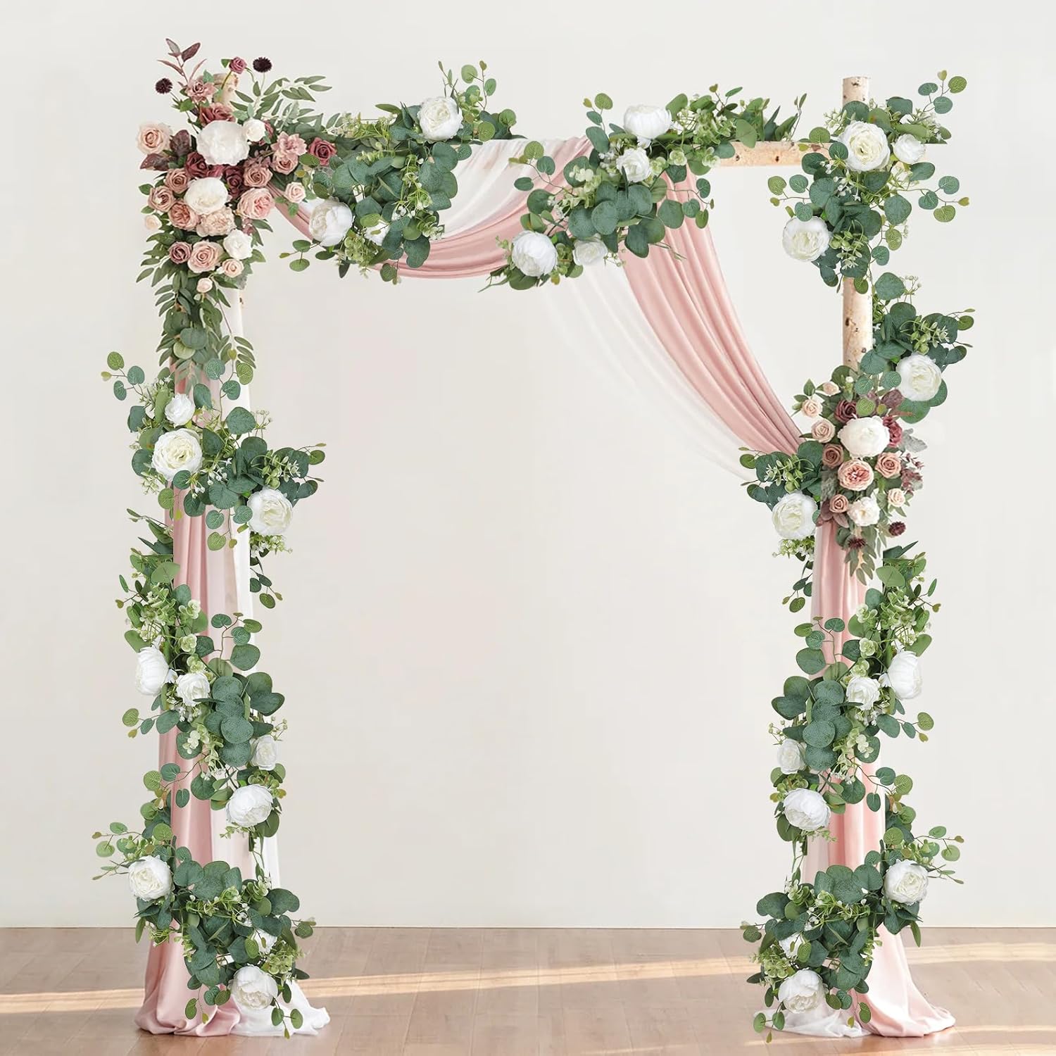 Изкуствените розови гирлянди имат добра здравина, гъвкавост и могат да се огъват във всяка желана форма. Те могат да се използват според личните нужди, безплатен „Направи си сам“ дизайн, за украса на розовия гирлянд не само като интериорна декорация, но и като декорация за сватбен фон на открито или като декорация за маса.