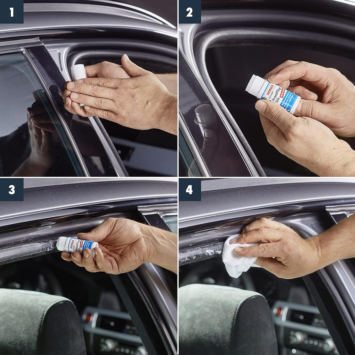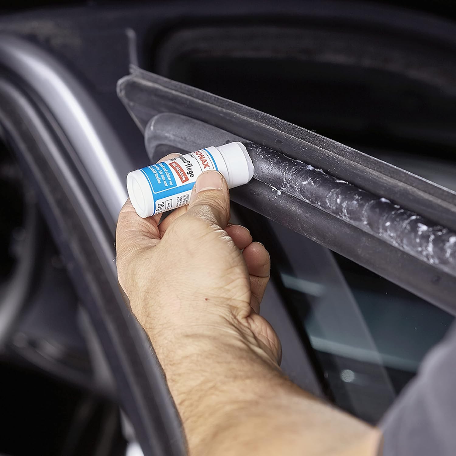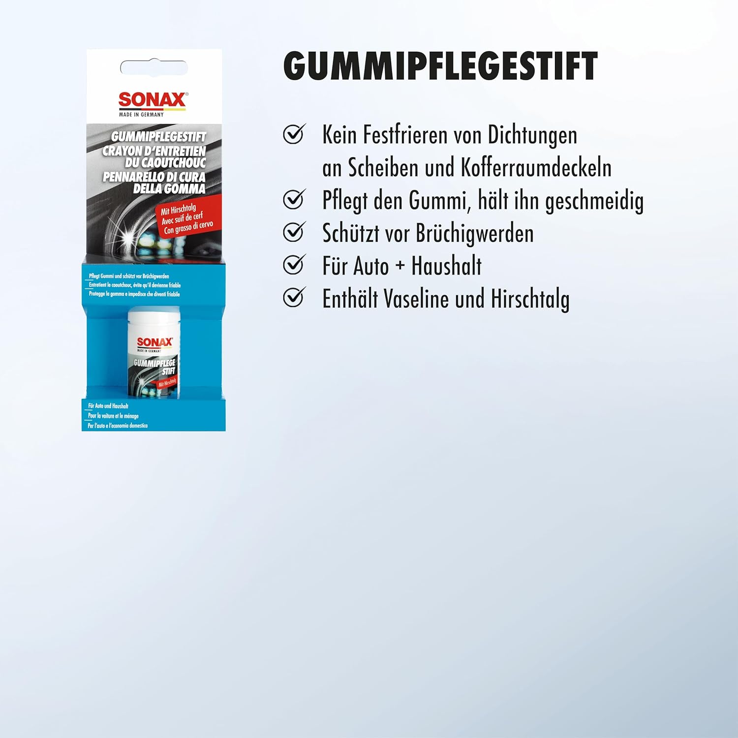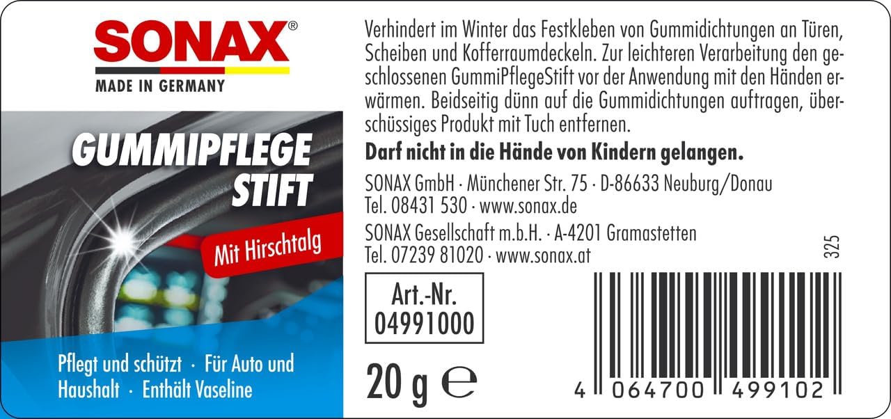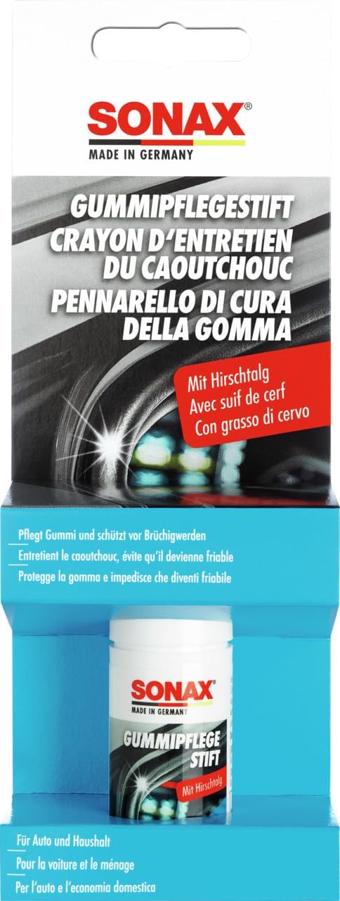 • Почистващият препарат за гуми SONAX почиства и се грижи за всички гумени части на автомобила и ги поддържа меки и еластични. Предпазва от залепване и замръзване на гумени уплътнения по врати, прозорци, капаци на багажник, люкове и покриви на кабриолети през зимата.