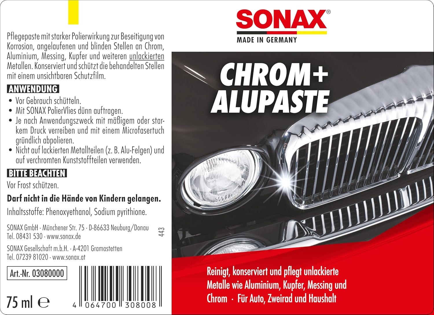 • Съдържание на кутията: 1x SONAX 03080000 паста за хром + алуминий (75 мл)