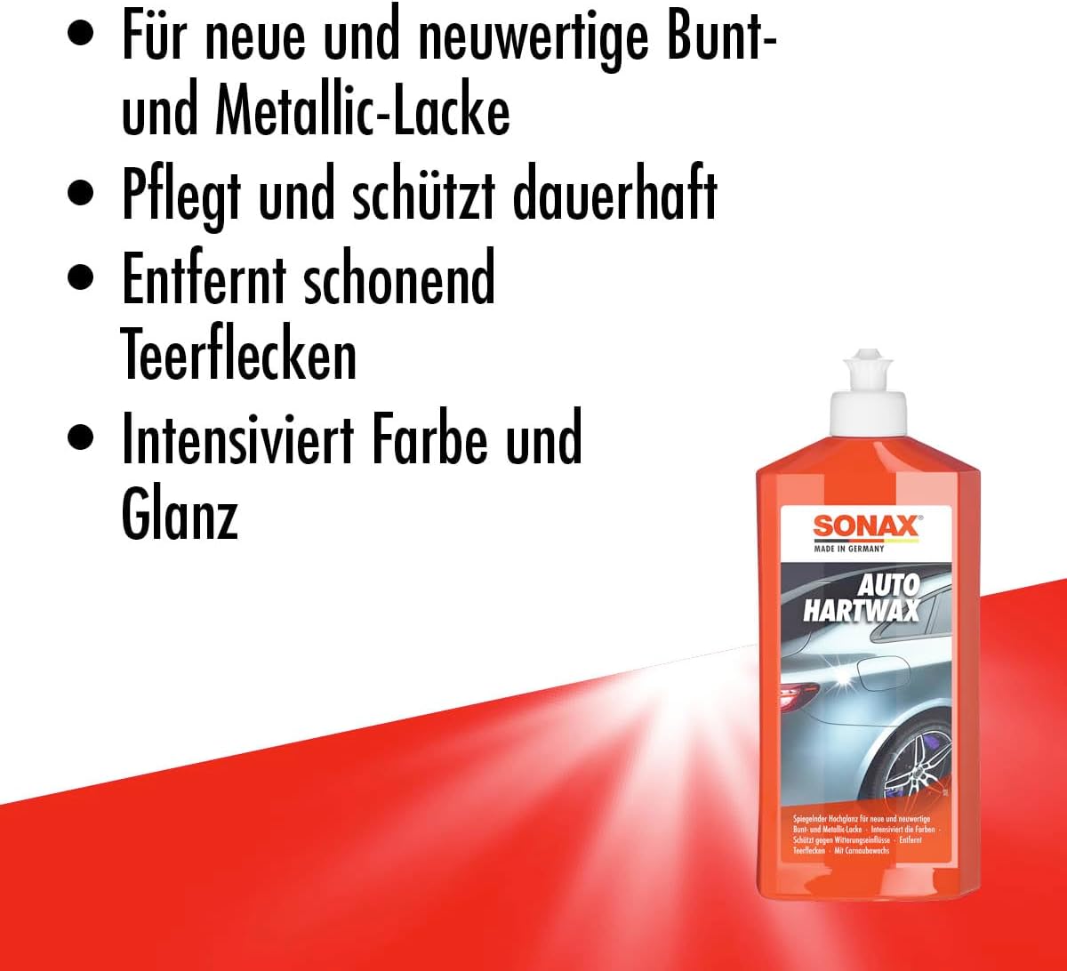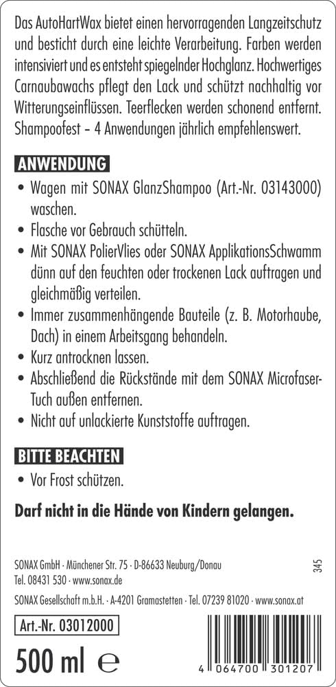 Течен твърд восък за нови и нови цветни и металически лакове. Висококачественият карнаубски восък се грижи за боята и я предпазва от атмосферните влияния. Петната от катран се отстраняват нежно. Осигурява отлична дълготрайна защита и отпечатъци с лесната си обработка. Цветовете се интензифицират и създават огледален висок гланц.