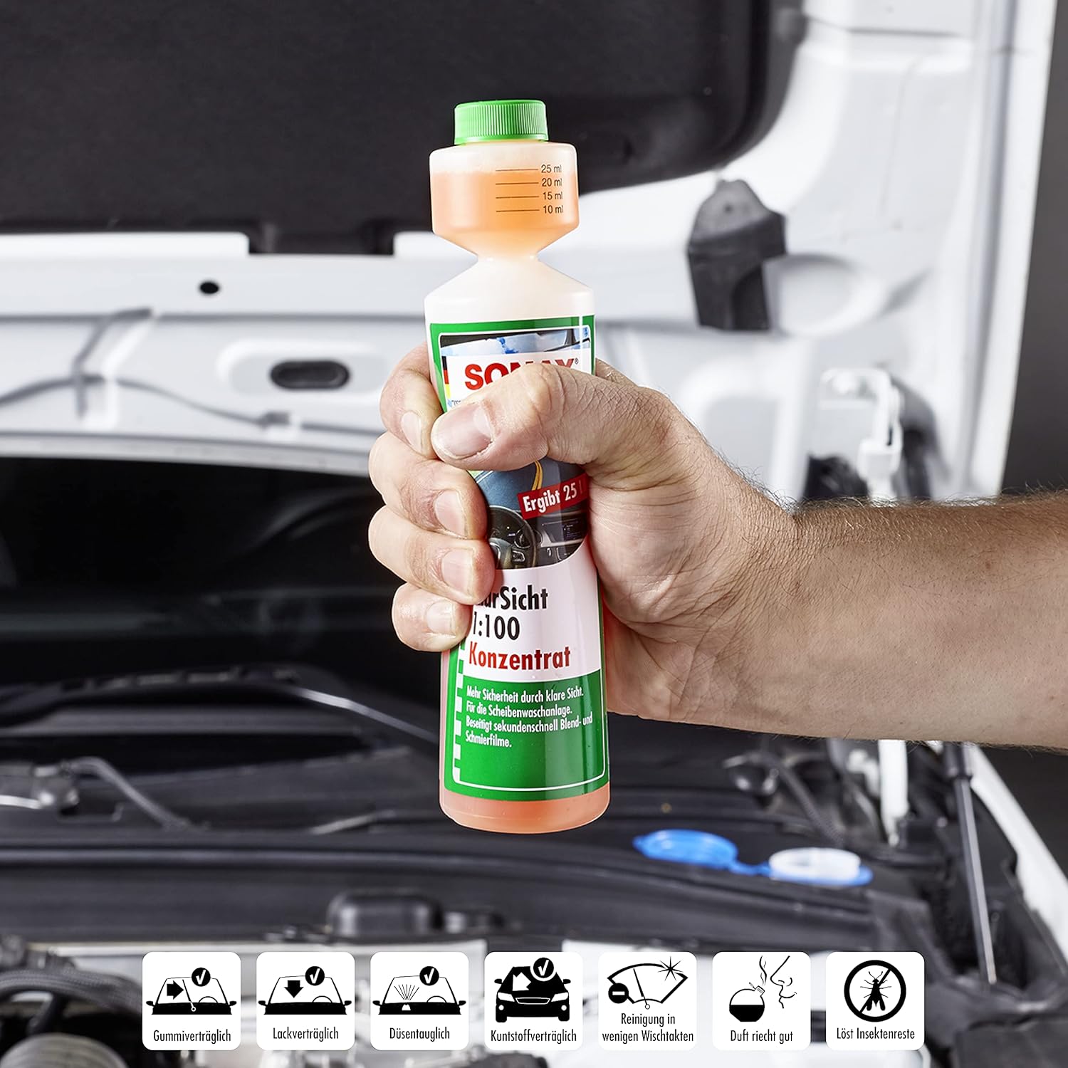 • Силно концентрирана почистваща добавка за системата за измиване на предното стъкло при лятна употреба. Само 25 мл правят 2,5 литра почистваща течност. Премахва насекоми, масло, сажди, силикон и опасни отблясъци и смазочни филми.