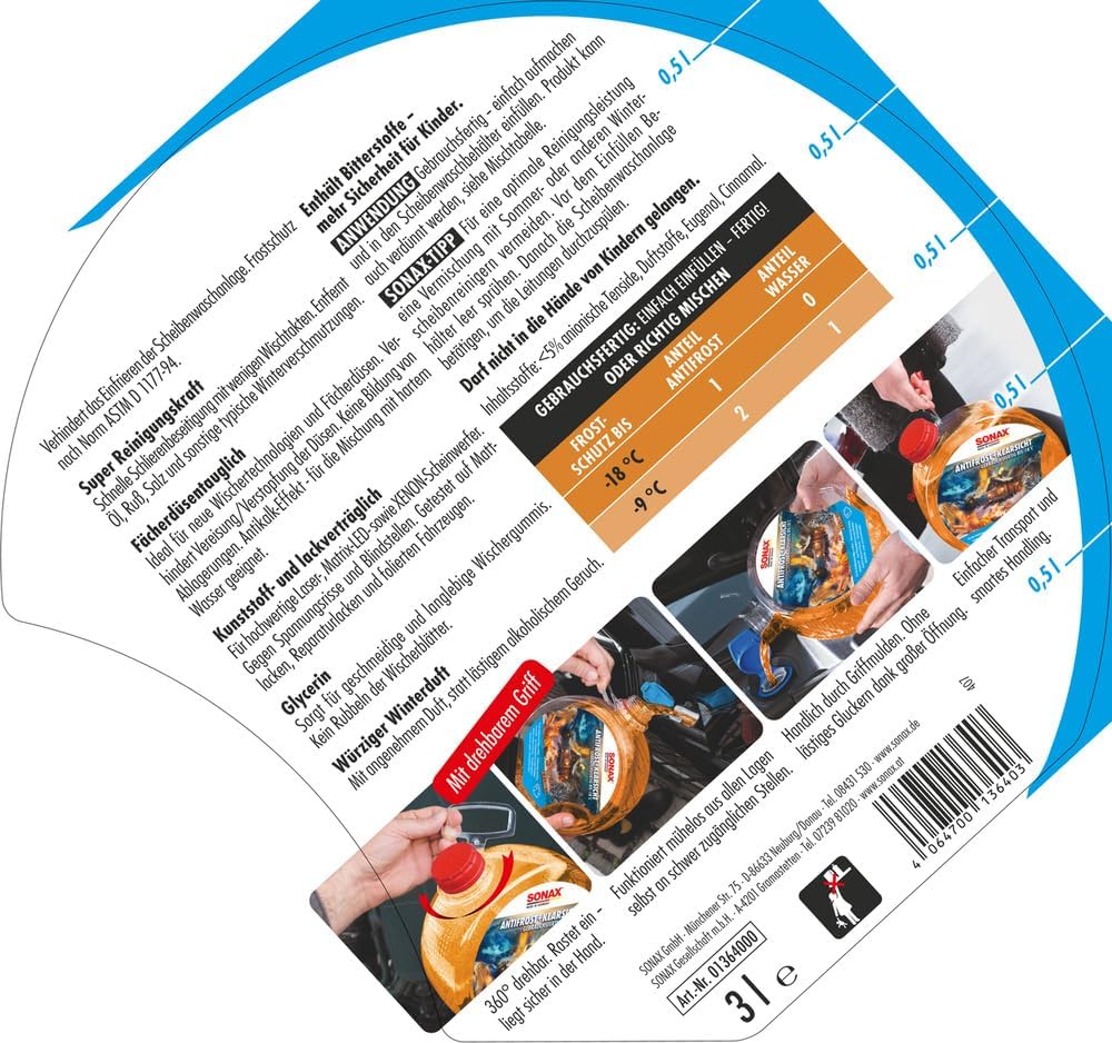 • Съдържание на кутията: 1x SONAX 01385000 антизамръзващ препарат + ясен вид, готов за употреба до -18°C Green Forest (5 литра)