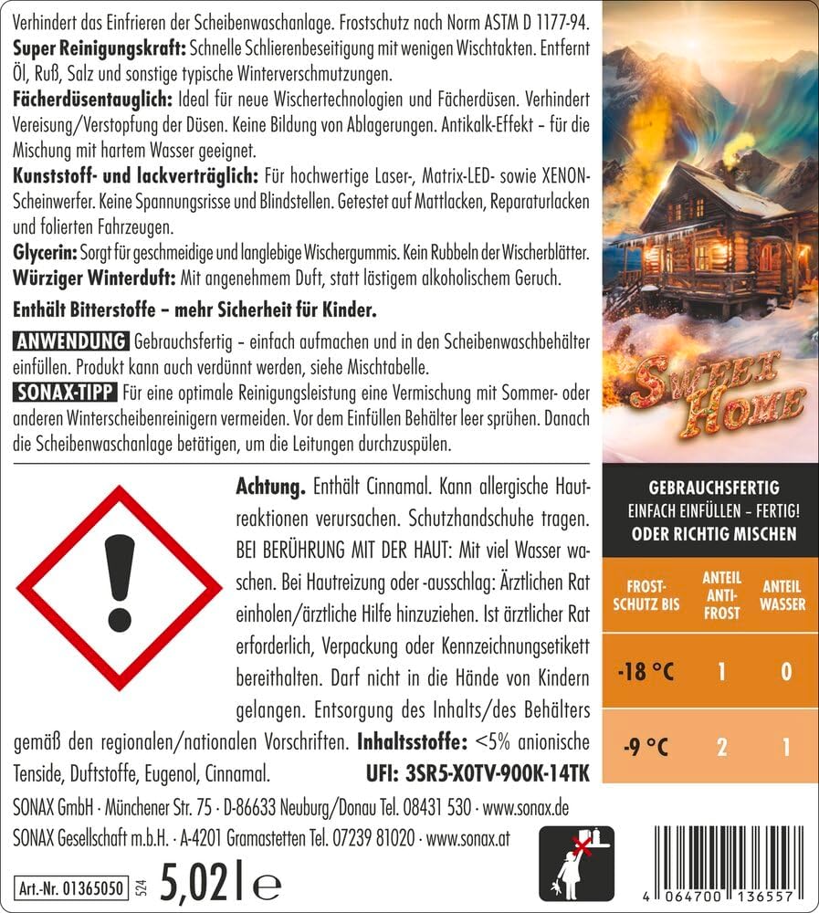 SONAX Antifreeze + Clear View до -18 °C Sweet Home (5 литра) Бърз, без следи и ефективен препарат за почистване на предни стъкла за зимата | Артикулен номер 01365050