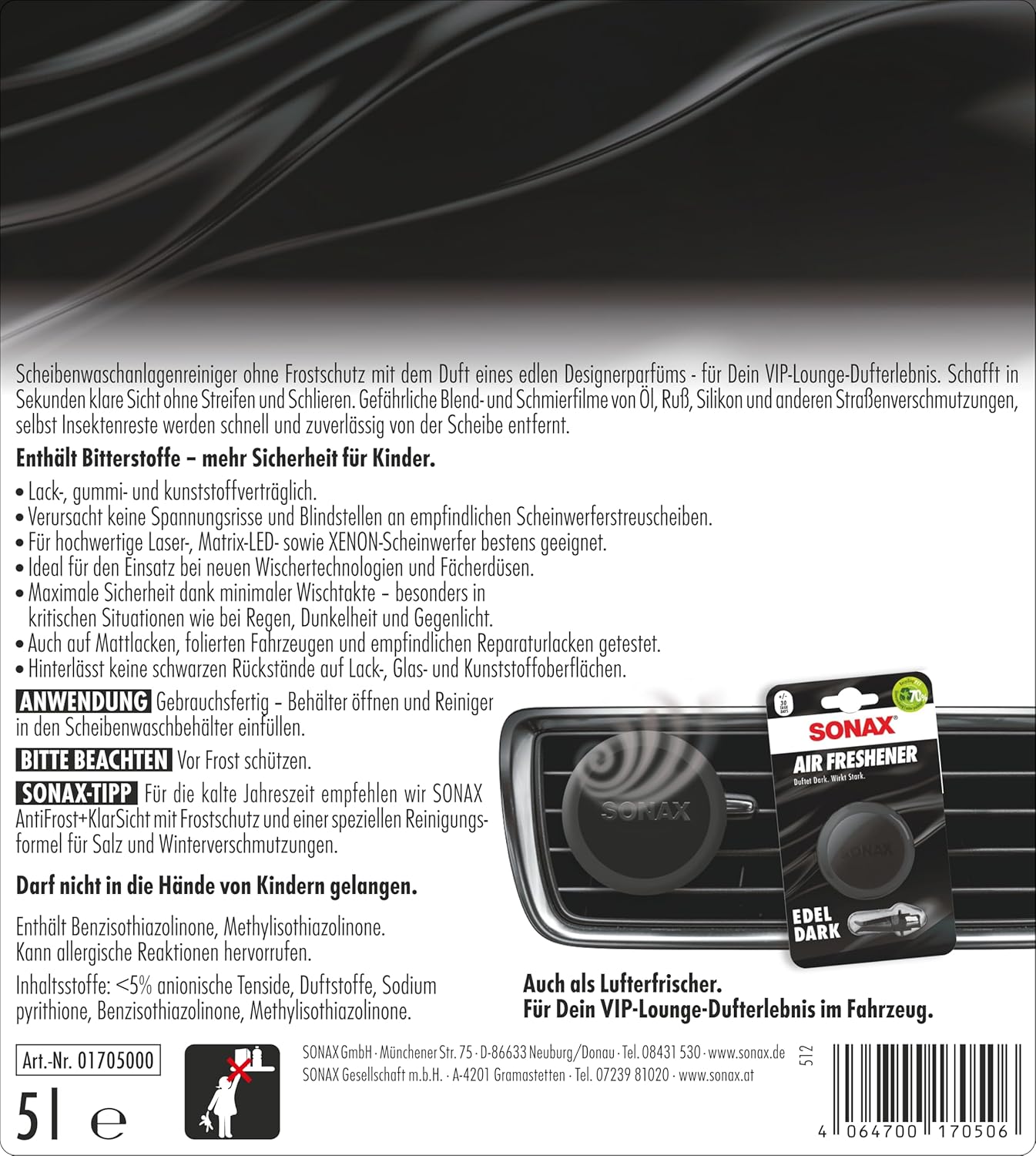 • Съдържание на кутията: 1x SONAX 01705000 готов за употреба препарат за почистване на предни стъкла Edeldark (5 литра)