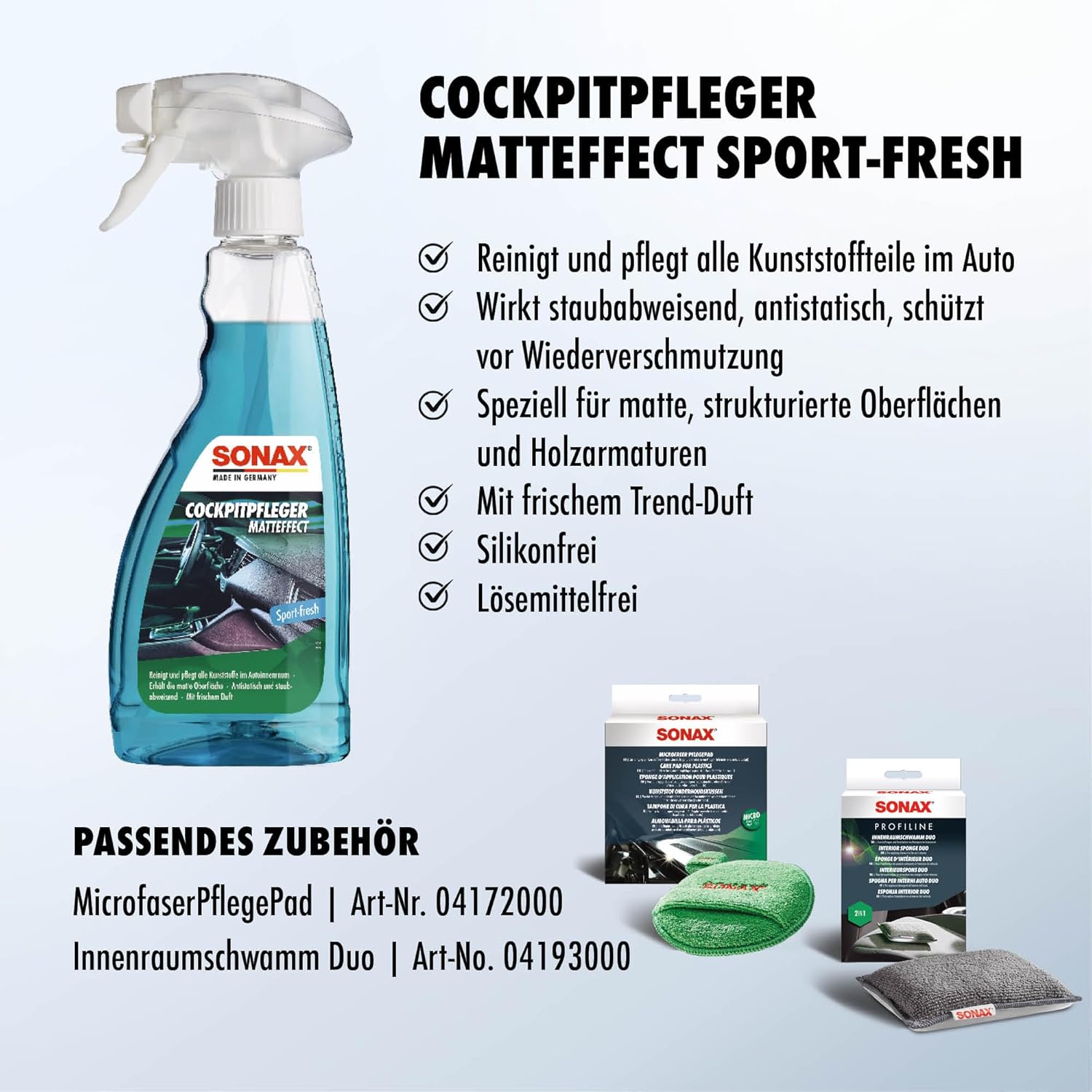 SONAX Почистващ препарат за кокпит Matte Effect Sport Fresh (500 мл) Почиства и се грижи за всяка пластмасова част в автомобила, артикулен номер 03572410