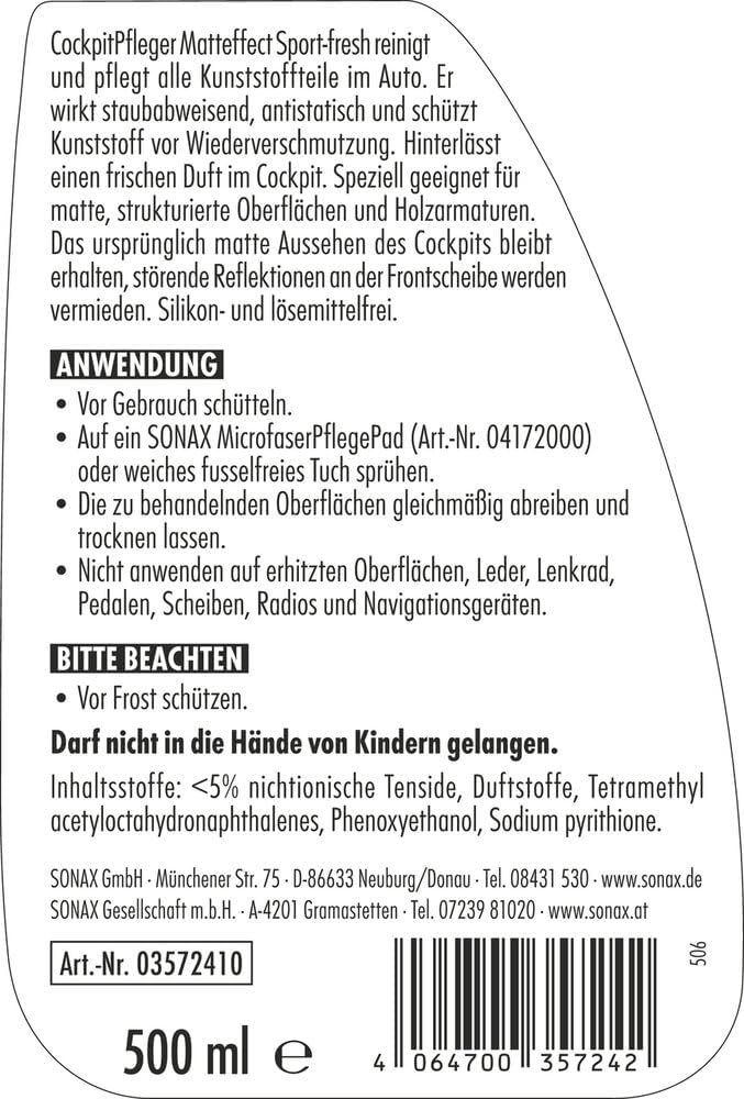 • Съдържание: 1 x SONAX 03572410 Почистващ препарат за кокпит с матов ефект Sport Fresh (500 мл).