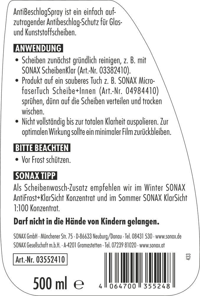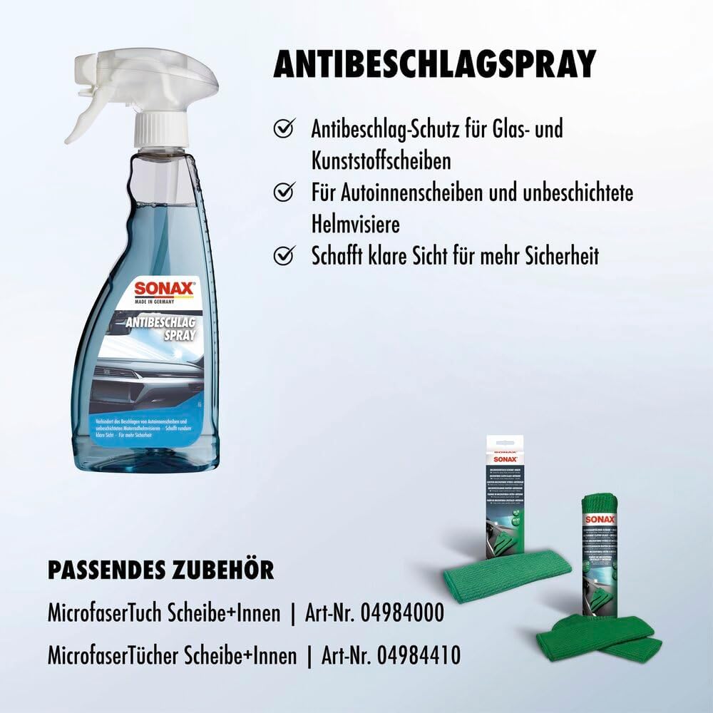 • Спреят Sonax AntiBeschlag е проста защита против замъгляване на стъклени и пластмасови панели. С подобрен дълготраен ефект.