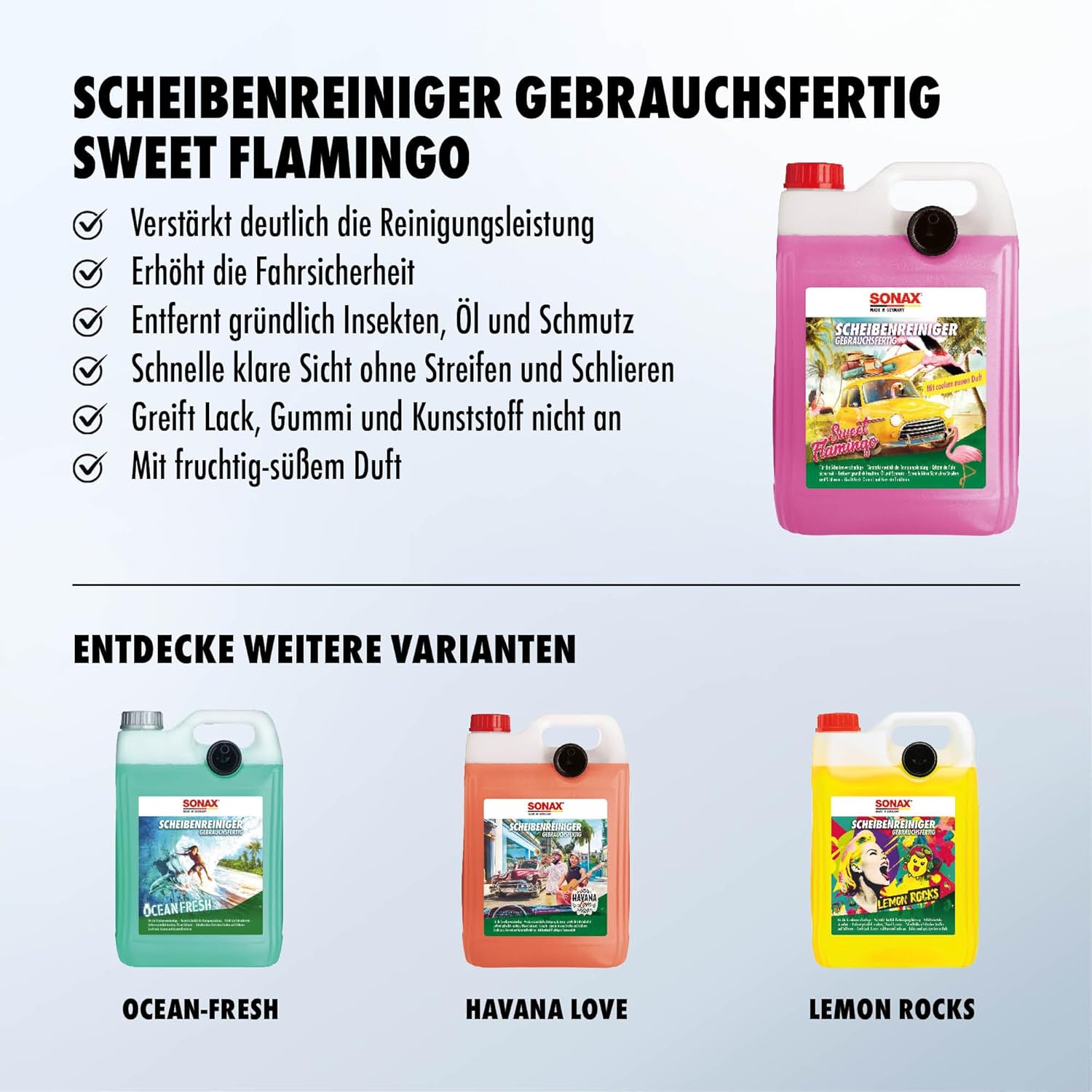• Съдържание на кутията: 1x SONAX 03945000 готов за употреба препарат за почистване на предни стъкла Sweet Flamingo (5 литра)