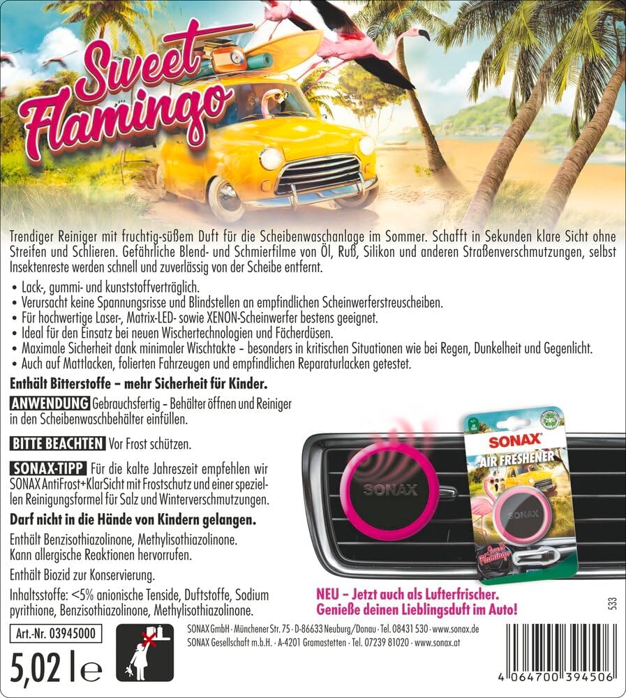 SONAX Sweet Flamingo, препарат за почистване на предни стъкла, готов за употреба (5 литра), усилва почистващата ефективност и повишава безопасността при шофиране. Артикулен номер 03945000