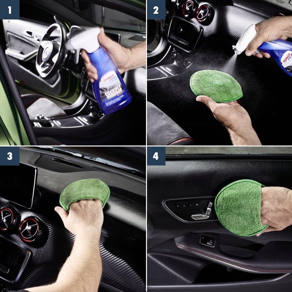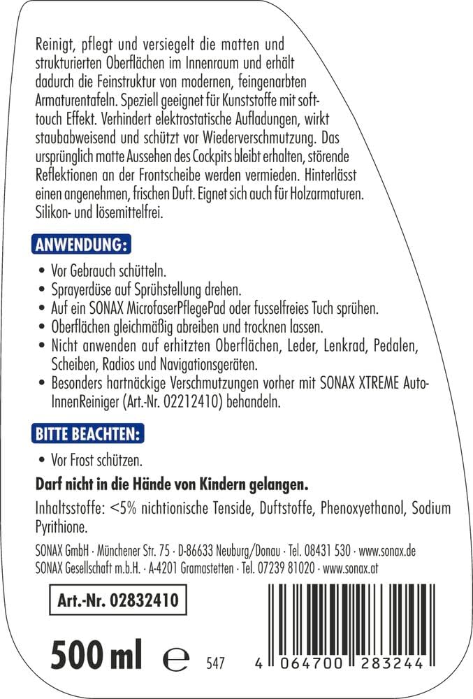 SONAX Xtreme 0283410 Почистващ препарат за табло, матов ефект (500 мл), Почистване и грижа за всички пластмасови интериори на автомобили. Запечатва матови и текстурирани повърхности и по този начин запазва фината структура на съвременните финозърнести табла. Особено подходящ за пластмаси с мек на допир ефект. Надеждно предотвратява електростатичните заряди, отблъсква прах и предпазва от по-нататъшно замърсяване. Оригиналният матов вид на таблото се запазва и се избягват разсейващи отражения върху предното стъкло с приятен, свеж аромат. Без силикон и разтворители. Употреба: Разклатете преди употреба. Поставете дюзата на спрея в позиция за пръскане. Напръскайте върху микрофибърна подложка SONAX или кърпа без власинки. Разтъркайте равномерно върху повърхностите и оставете да изсъхне. Моля, обърнете внимание: Не използвайте върху нагряти повърхности, кожа, волан, педали, прозорци, радиостанции и навигационни устройства. Пазете далеч от деца. Пазете от замръзване. Съдържание на кутията: 1x SONAX 0283410 XTREME почистващ препарат за табло, матов ефект (500 мл). Продукти за грижа за автомобил SONAX – Произведено в Германия – за брилянтен външен вид. SONAX разработва и произвежда високоефективни продукти за грижа за автомобила от 1950 г. в Нойбург на Дунав, които отговарят на най-високите изисквания. Независимо дали в моторните спортове, в тунинг сцената или в света на класическите автомобили: Когато става въпрос за перфектно представяне на автомобили, SONAX винаги ще бъде на разположение, както за автомобилни фенове, така и за експерти. - -