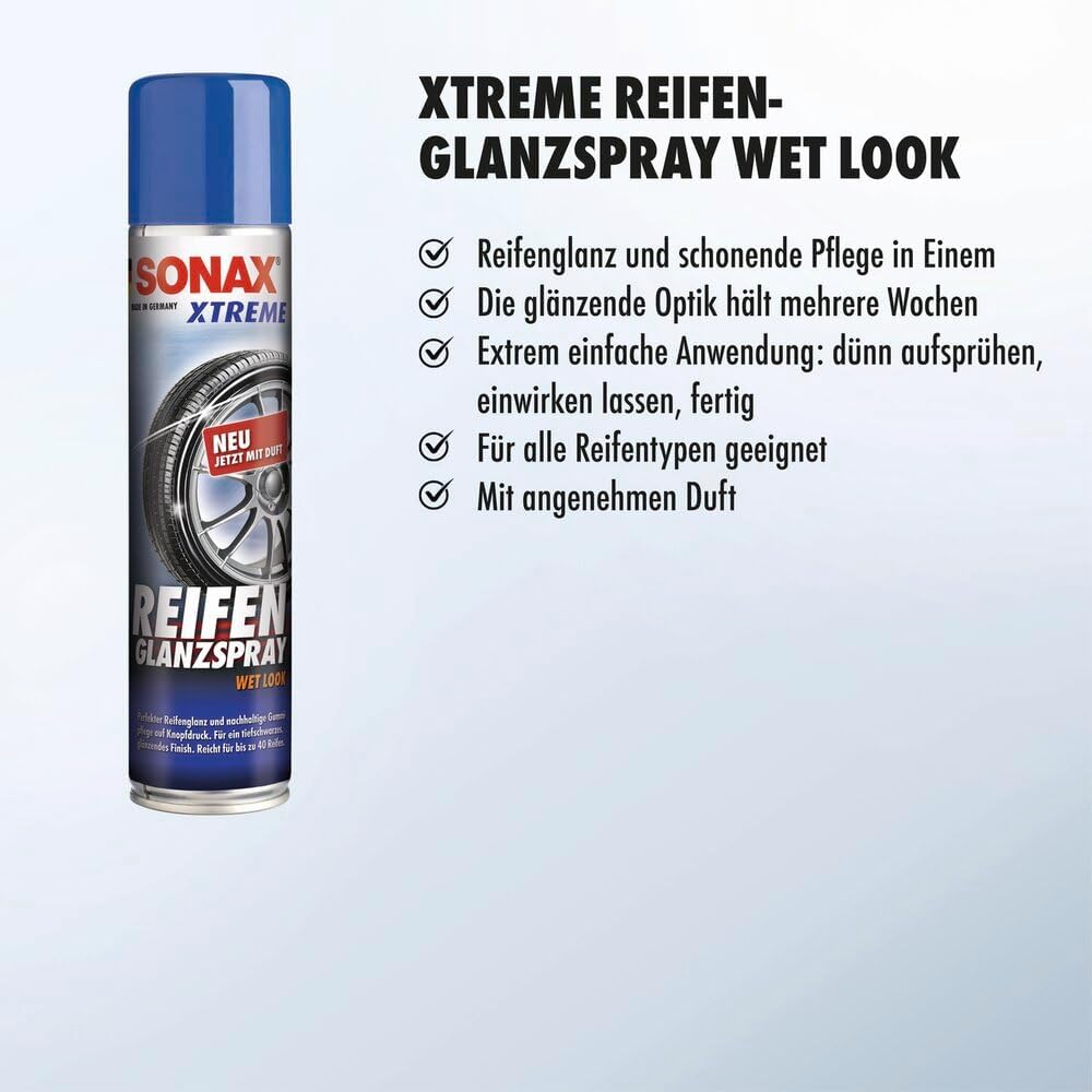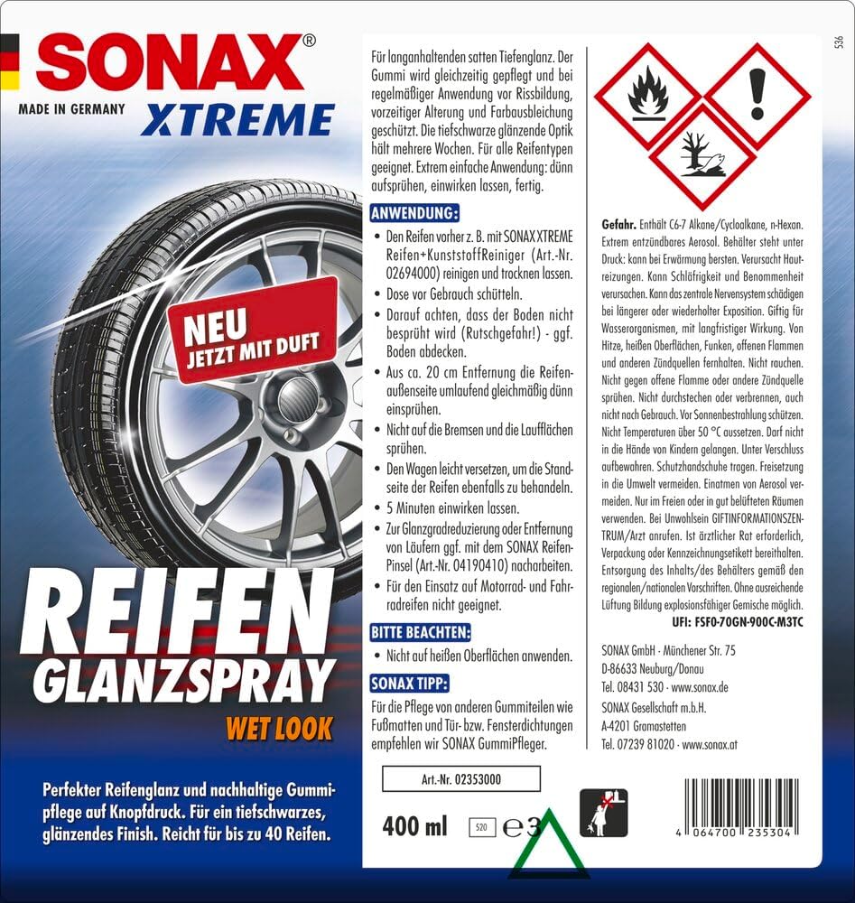 • Съдържание: 1 x SONAX 02353000 Xtreme спрей за гланц за гуми с мокър вид (400 мл)