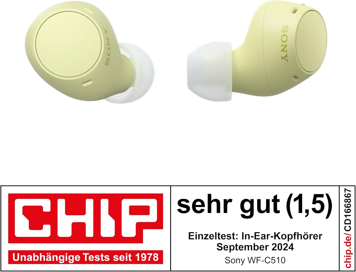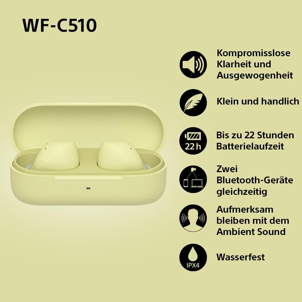 Sony WF-C510 Наистина безжични слушалки – малки, леки, Bluetooth слушалки за уши с многоточкова връзка, околен звук, IPX4 рейтинг, Spotify Tap, бързо зареждане, 22 часа живот на батерията, iOS и Android – жълти