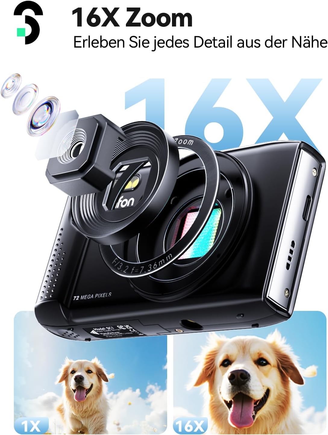 • Гъвкави режими на снимане с 16x цифрово увеличение: Този цифров фотоапарат за деца и начинаещи съчетава лесно управление с разнообразие от вълнуващи функции. С 16x цифрово увеличение, отдалечени обекти могат лесно да бъдат увеличени. Цифровият фотоапарат поддържа автоматичен, ръчен и фиксиран фокус, така че всеки кадър може да бъде регулиран индивидуално.