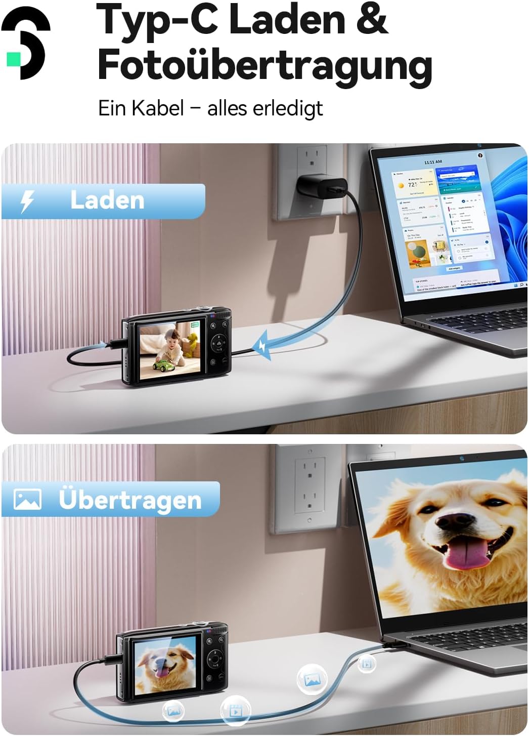 • Богати аксесоари и готовност за употреба: 32 GB microSD картата вече се използва в ретро цифровия фотоапарат - просто го включете и започнете. 2 x 800 mAh батерии предлагат по-дълго време на работа. USB-C кабелът се използва за зареждане и прехвърляне на данни към компютъра. Освен това са включени USB четец за карти, каишка за носене и торбичка за прах - идеални за пътуване или ежедневна употреба.