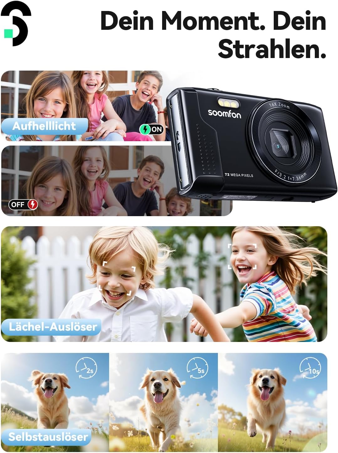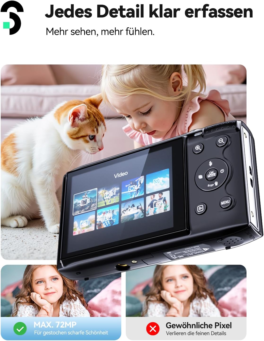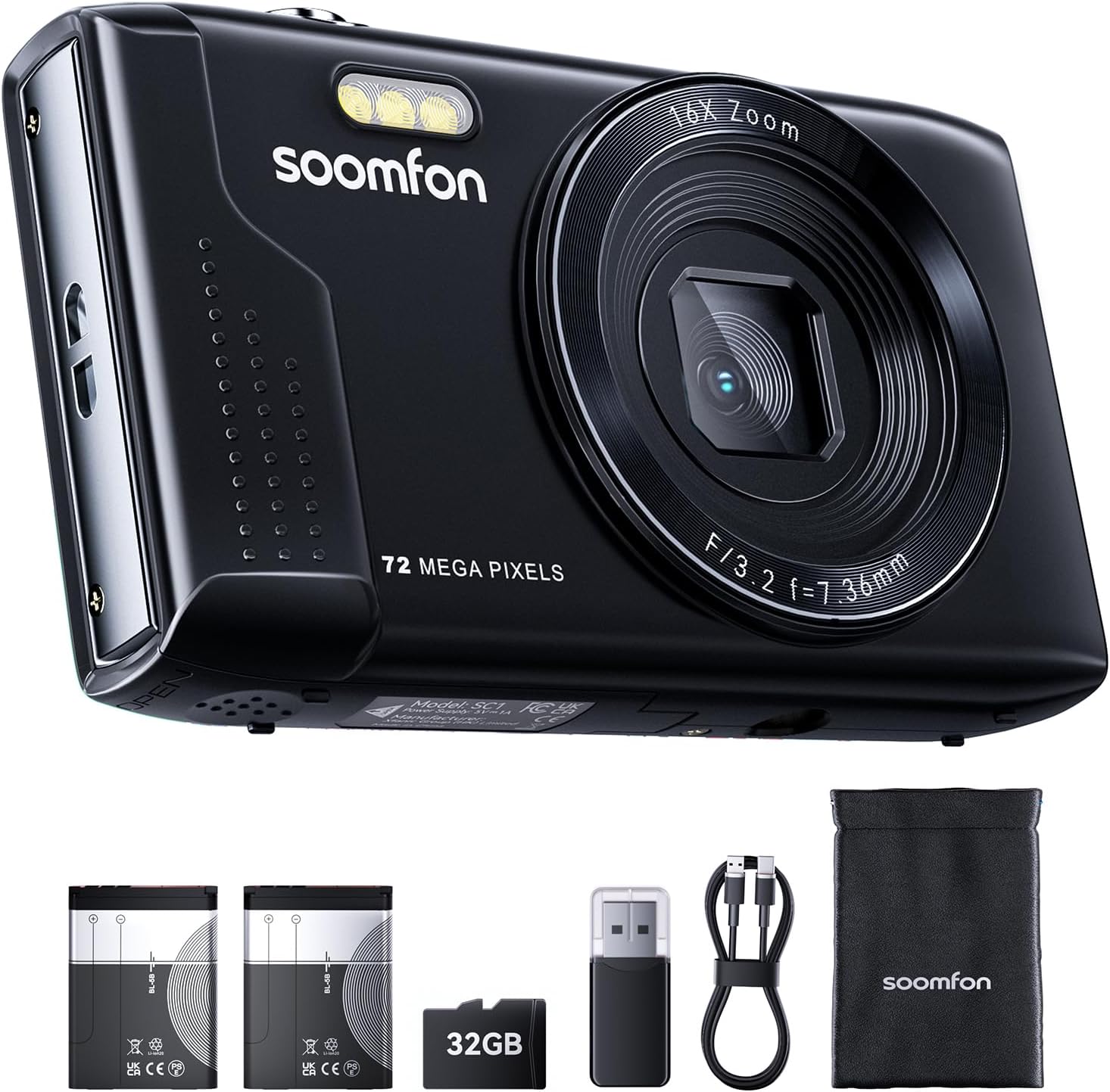 SOOMFON 72MP цифров фотоапарат, 16X увеличение с 32G TF карта, четец на карти и 2 x батерии, преносим цифров фотоапарат винтидж с 2.8-инчов екран, за деца, момчета и начинаещи (черен)