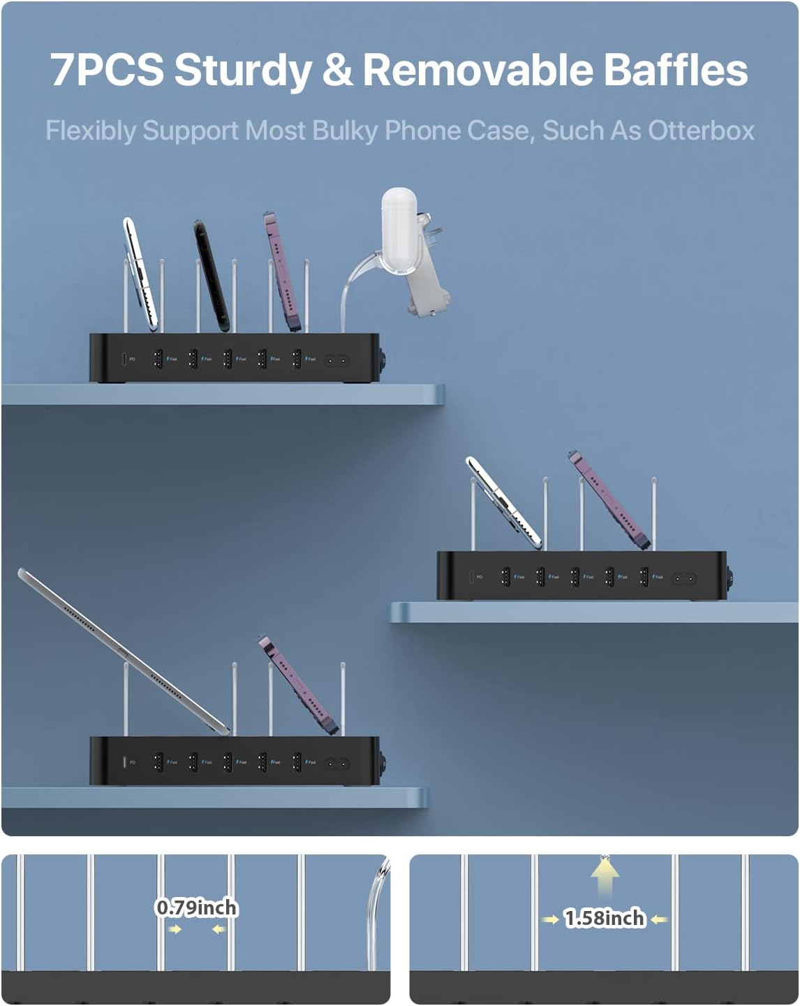 SooPii 60W 6-портова USB зарядна станция за множество устройства, PD 20W USB C бързо зареждане за iPhone 14/13/12, 2-в-1 държач за часовник, 6 кабела включени за телефони, таблети и други електронни устройства